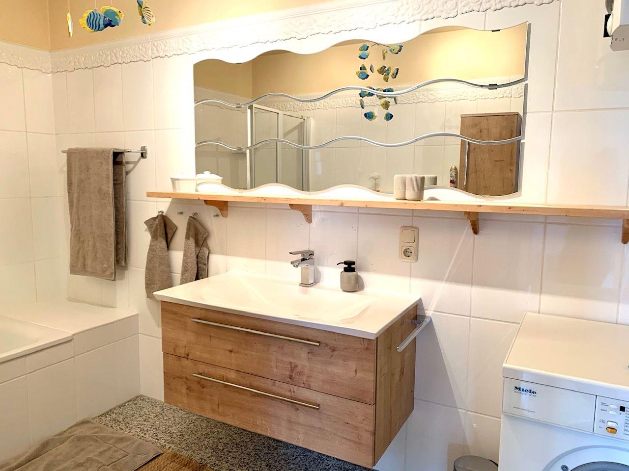 Das große Vollbad mit Badewanne und Waschmaschinen-/ Wäschetrockner-Kombination befindet sich ebenfalls im Erdgeschoss.