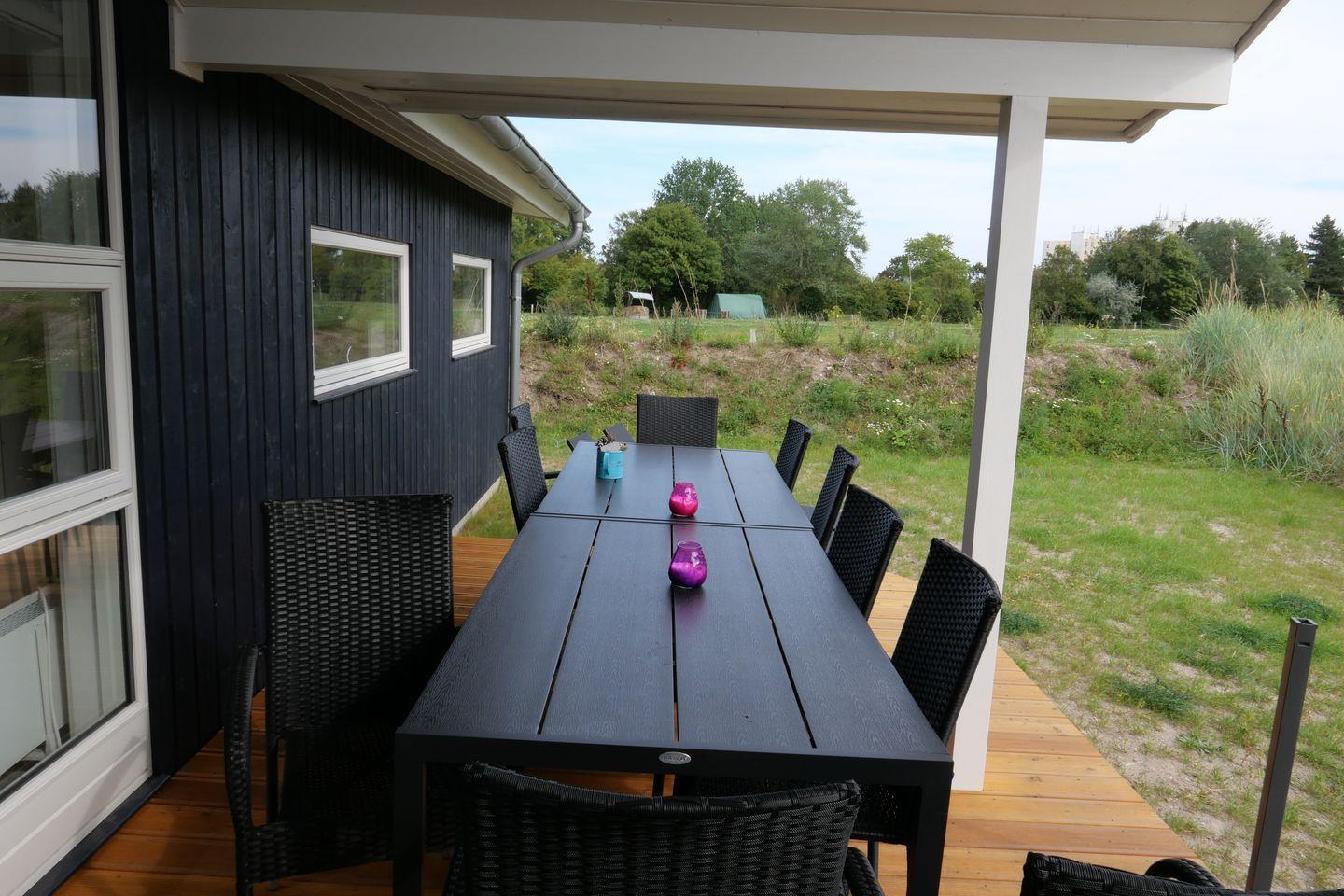 Vom Wohnbereich aus haben Sie Zugang zur teils überdachten, mit großem Gartentisch und Stühlen möblierten Terrasse, auf der Sie die langen Sommerabende genießen können. 2 Sonnenliegen stehen Ihnen ebenfalls zur freien Verfügung.