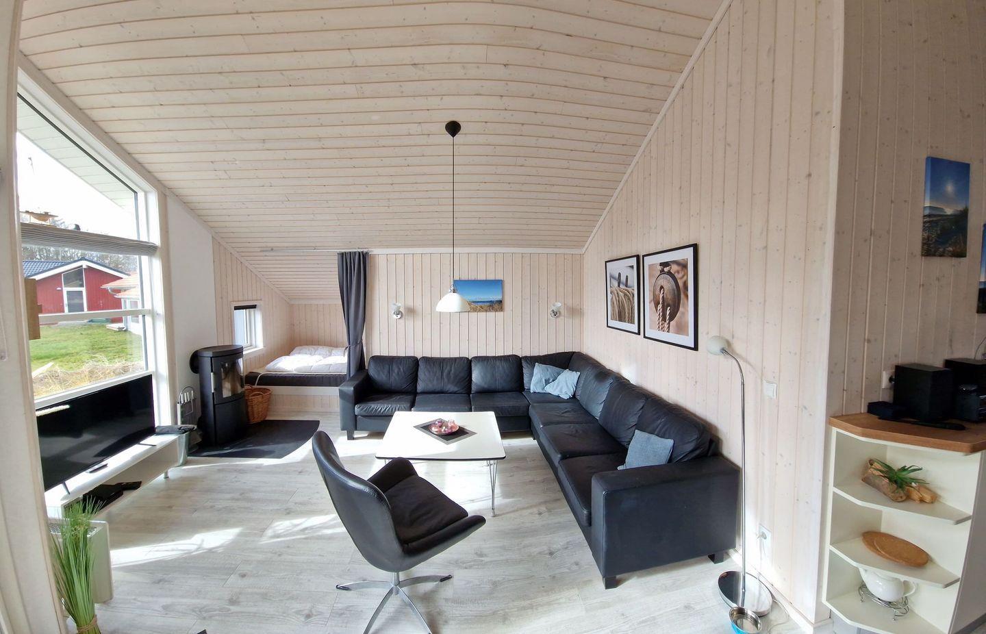 Das Ferienhaus ist geschmackvoll im skandinavischen Stil gestaltet und dabei sehr geräumig und hell. Große Fenster sorgen für viel Licht und eine angenehme Wohnatmosphäre.