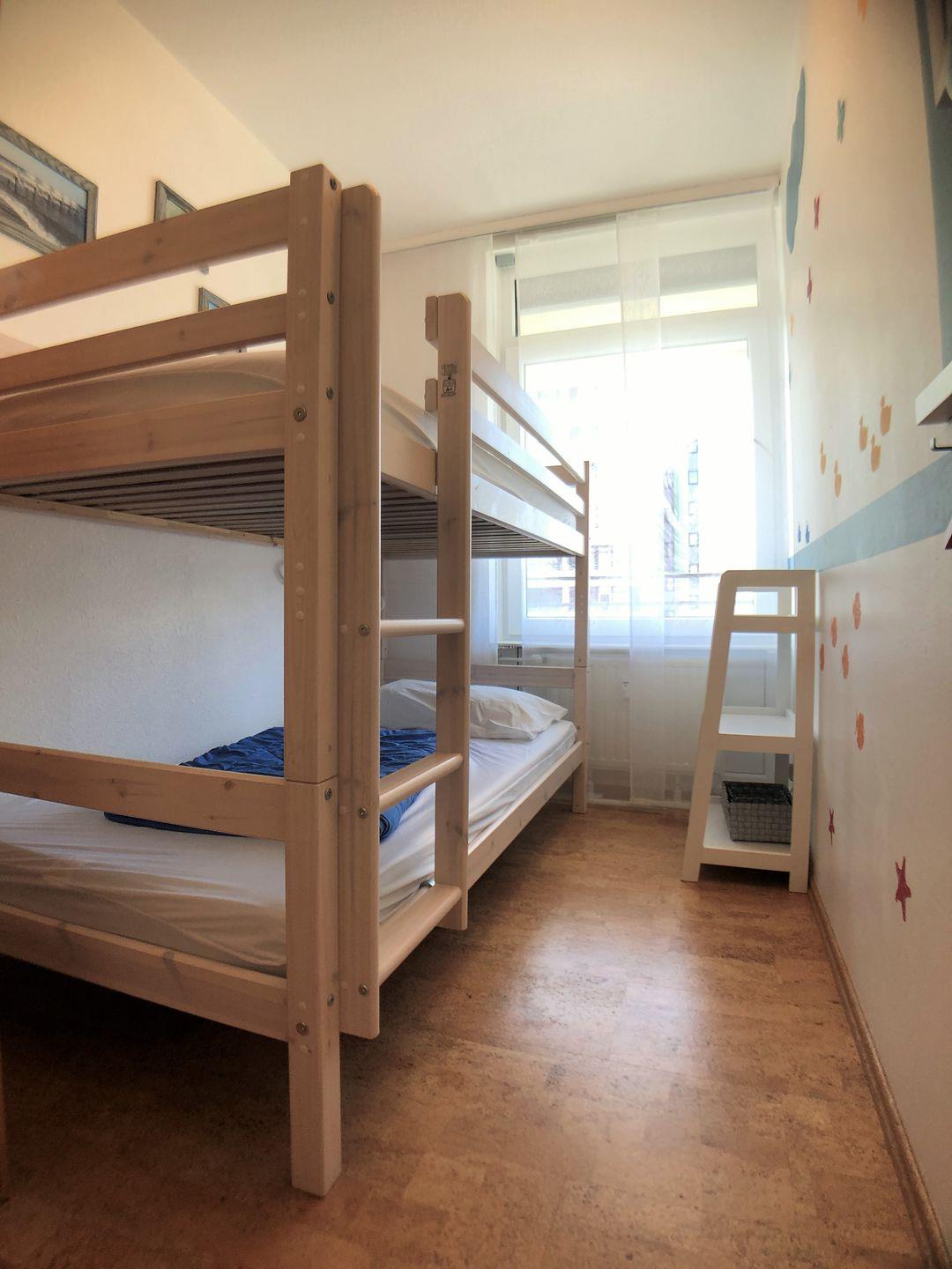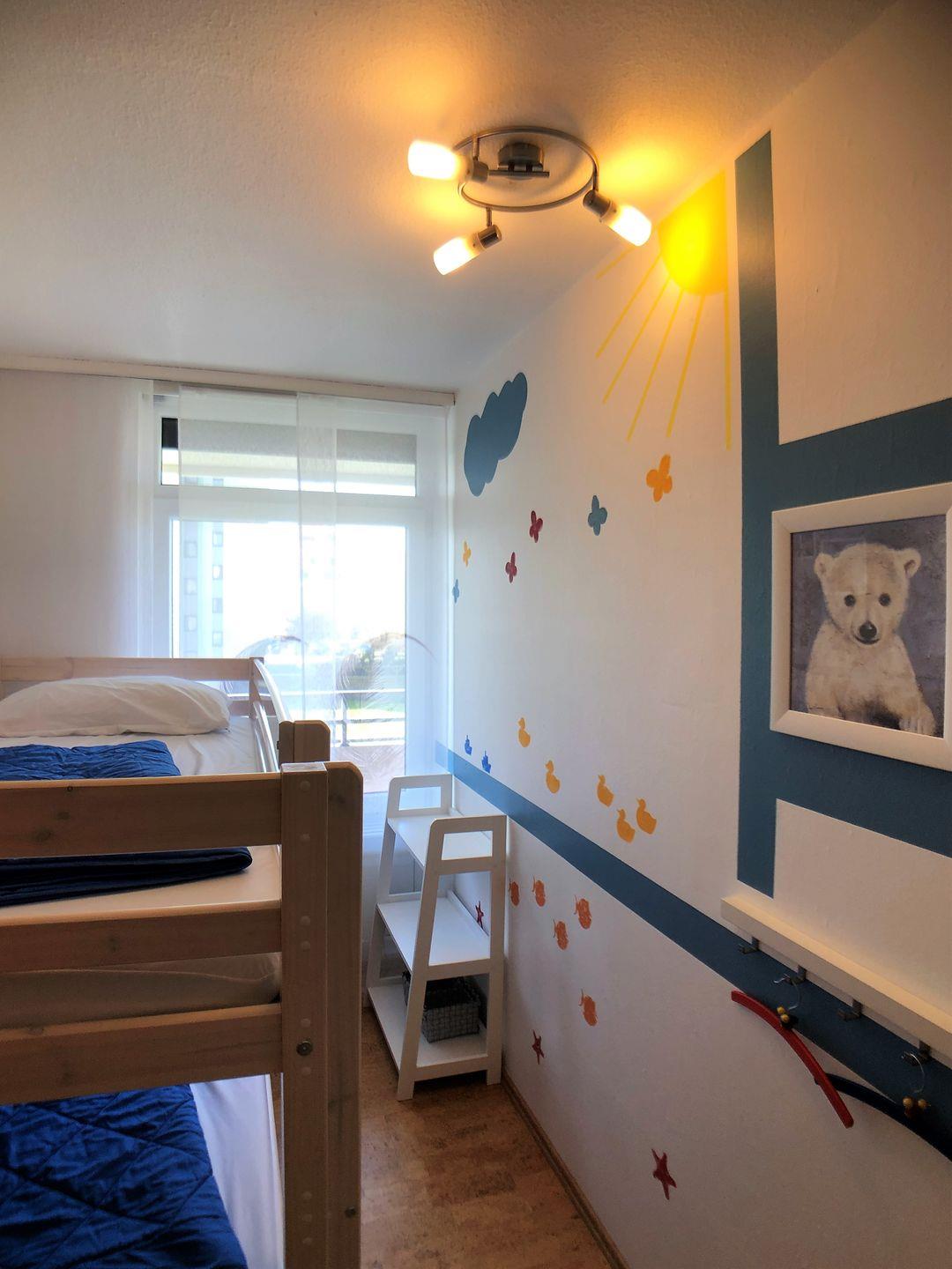 Im separaten Kinderschlafzimmer finden die Lütten je ein kuscheliges Nachtlager im Etagenbett (90*200 cm). Ein großer Kleiderschrank bietet Platz für die liebsten Urlaubsoutfits.