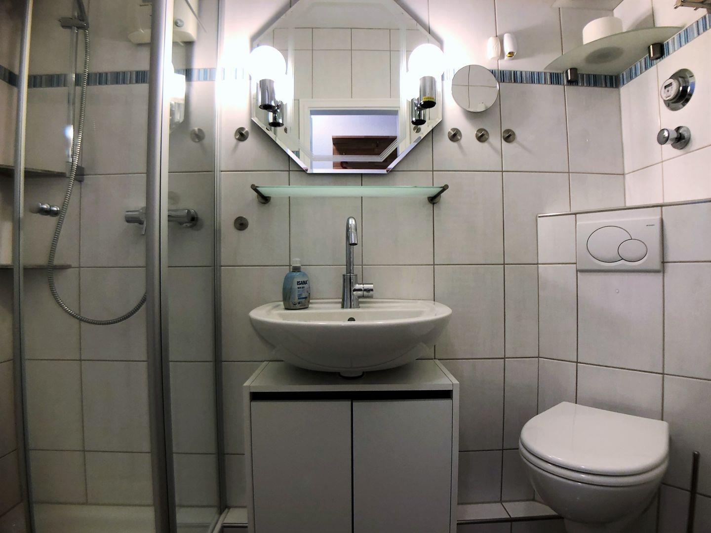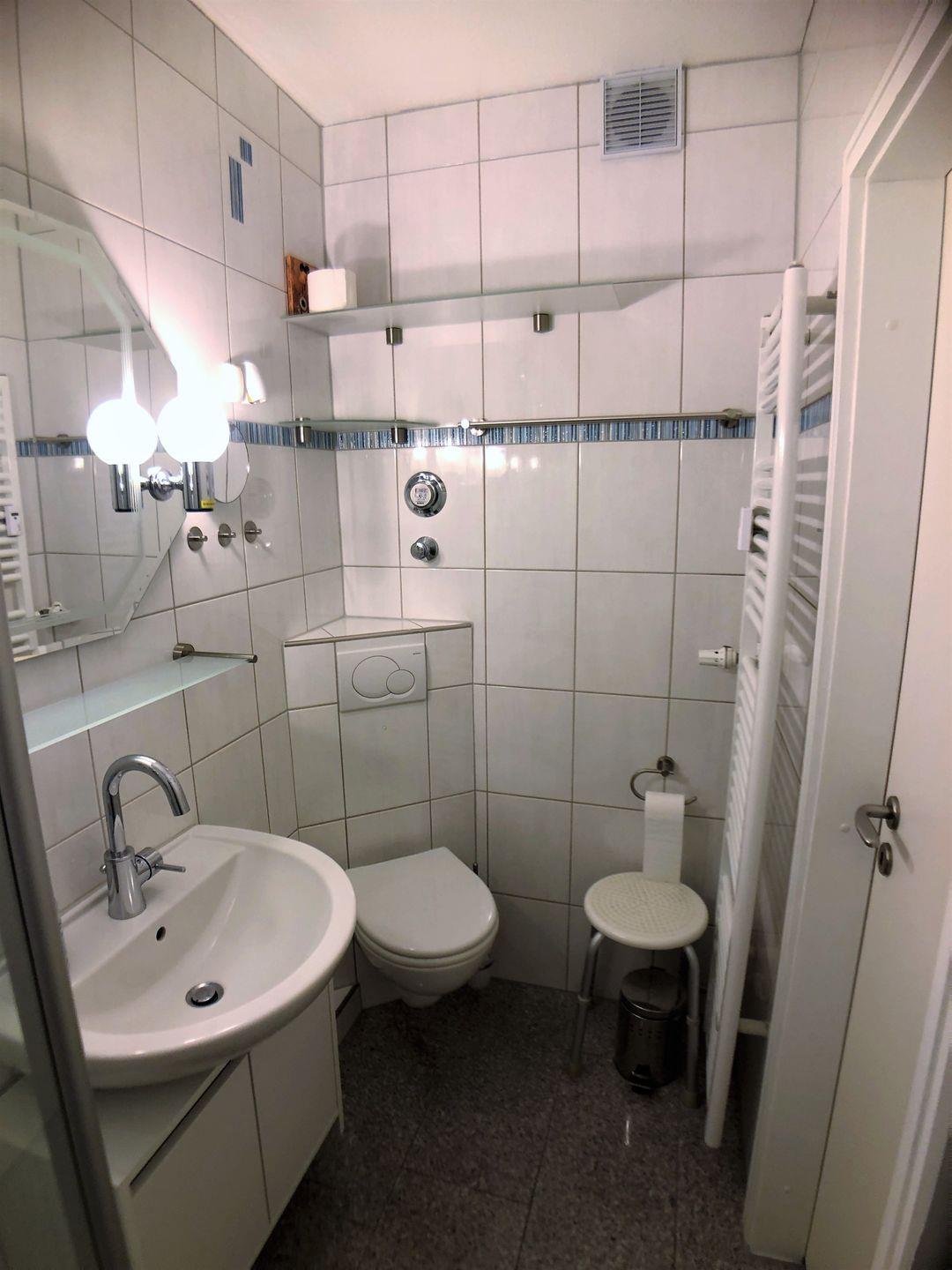 Das kleine, moderne Duschbad bietet eine Dusche mit Wanne und fester Glasduschwand, Waschbecken mit Unterschrank, Haartrockner, Beleuchtung und Steckdosen sowie WC und Handtuchheizkörper.