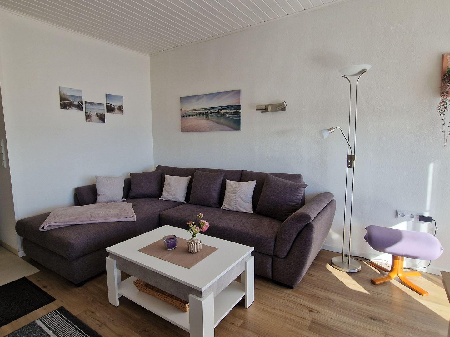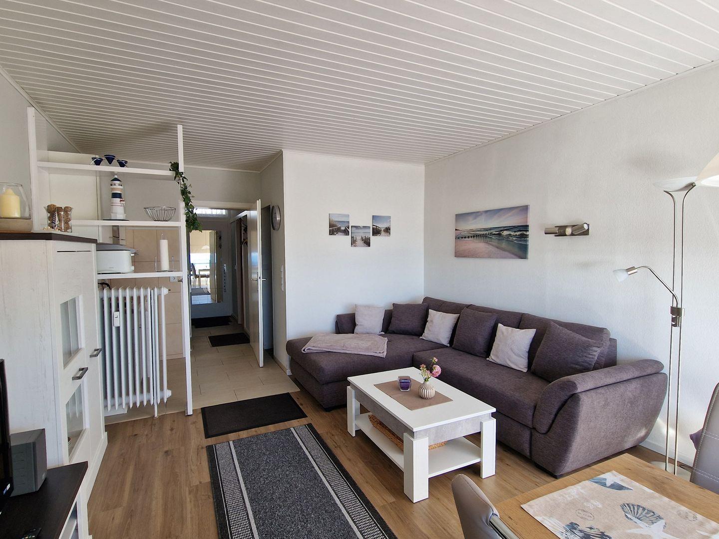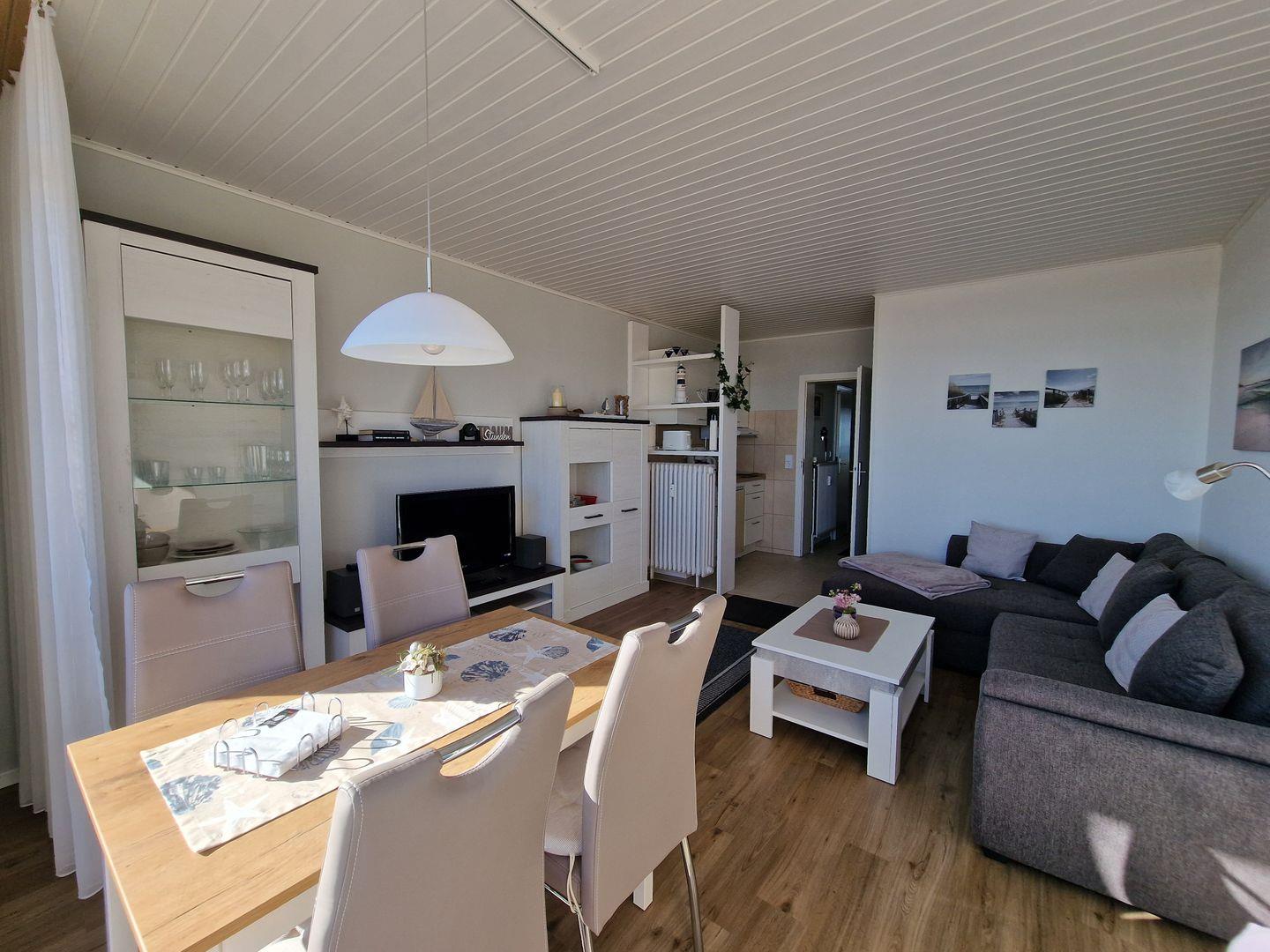 Der Wohnbereich wurde komplett neu renoviert und mit hochwertigem Vinyl ausgestattet. Direkt am großen Fenster befindet sich der einladende Essplatz mit freier Sicht auf den Badestrand mit Seebrücke. Die hochwertige Schlafcouch verfügt über einen weiteren Schlafplatz und lädt zum Relaxen oder entspannten Fernsehabenden ein. Auch einige Gesellschaftsspiele und Bücher stehen den Gästen zur Unterhaltung bereit, hier kommt keine Langeweile auf.