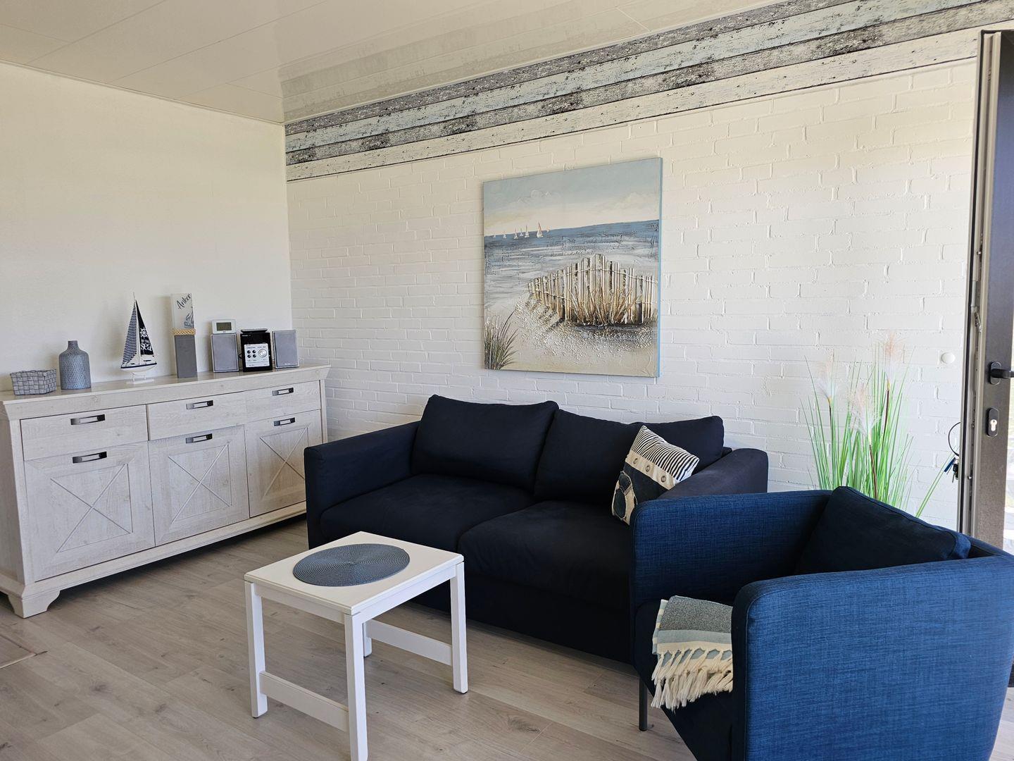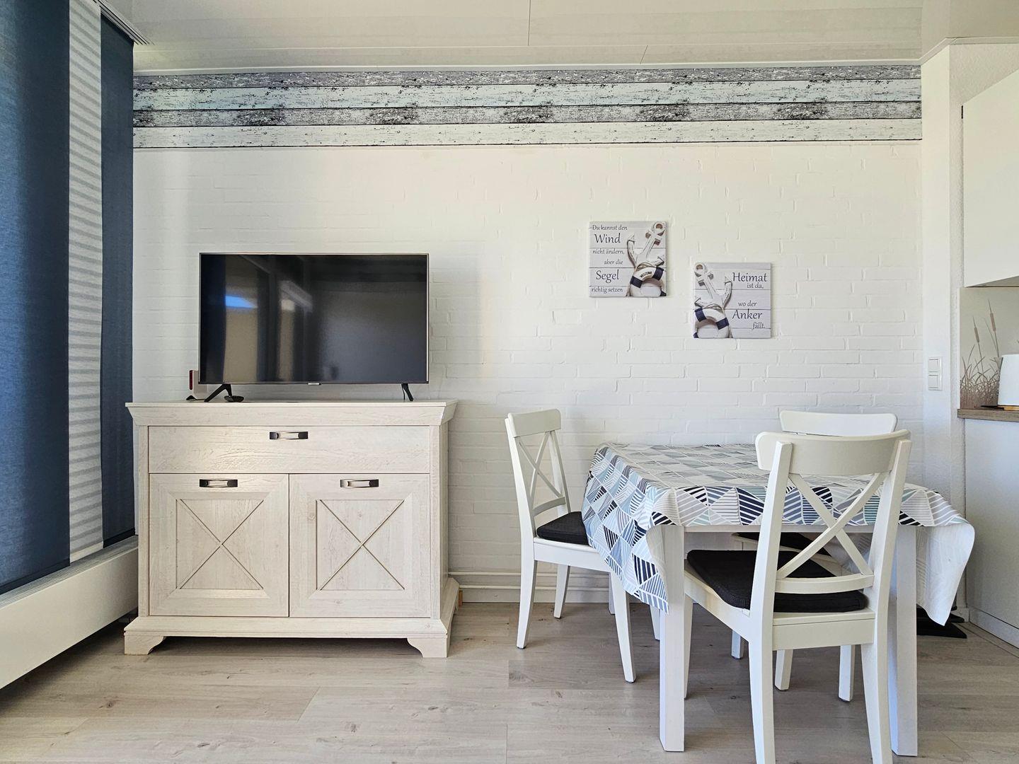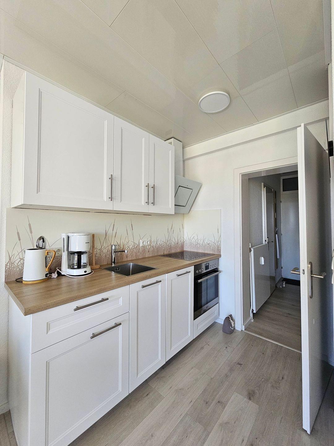 Die hell eingerichtete Wohnung im Erdgeschoss für bis zu 2 Personen empfängt Sie in einem kleinen Flur von dem das Bad und das abgeteilte Schlafzimmer abzweigen.
