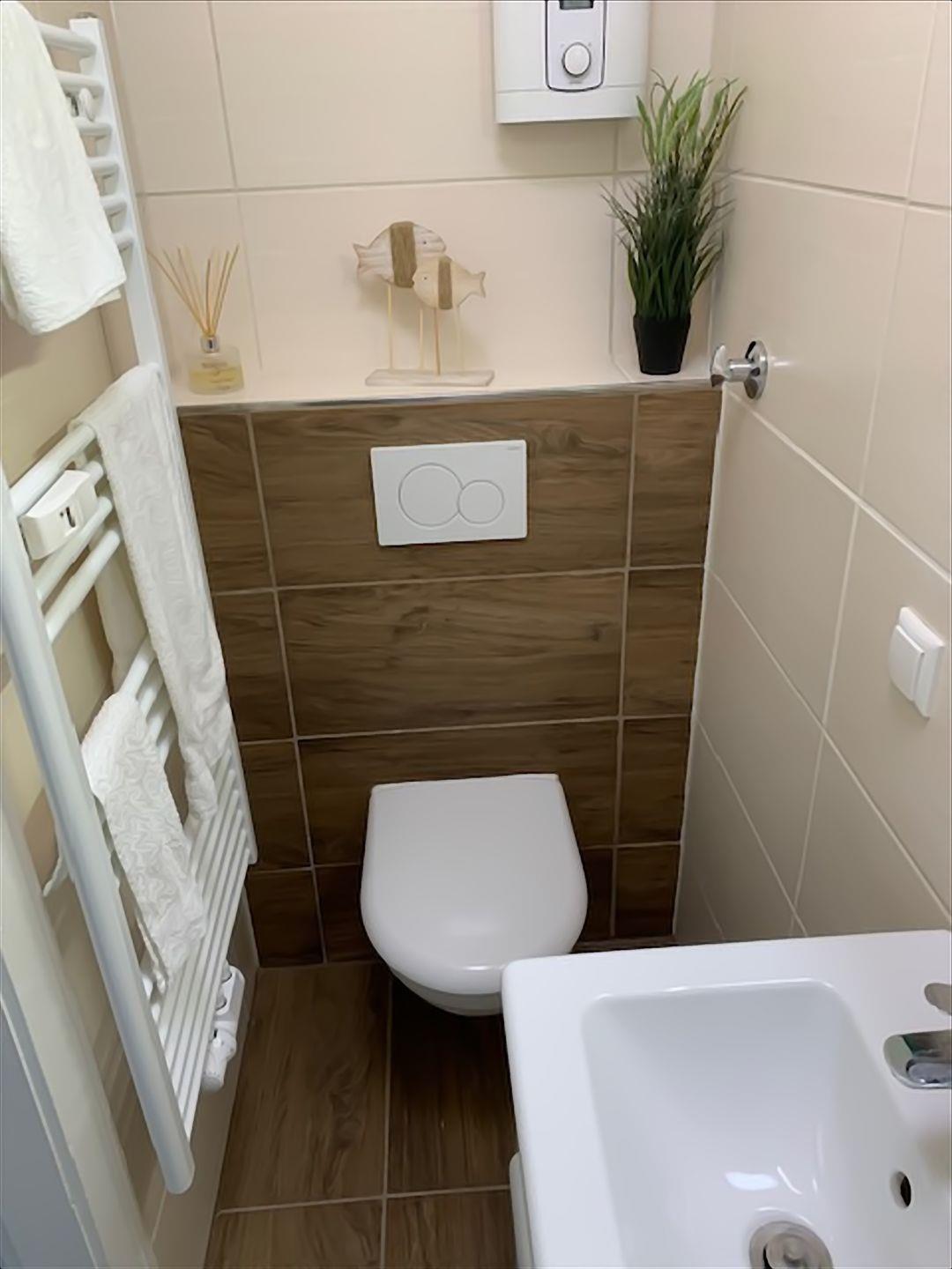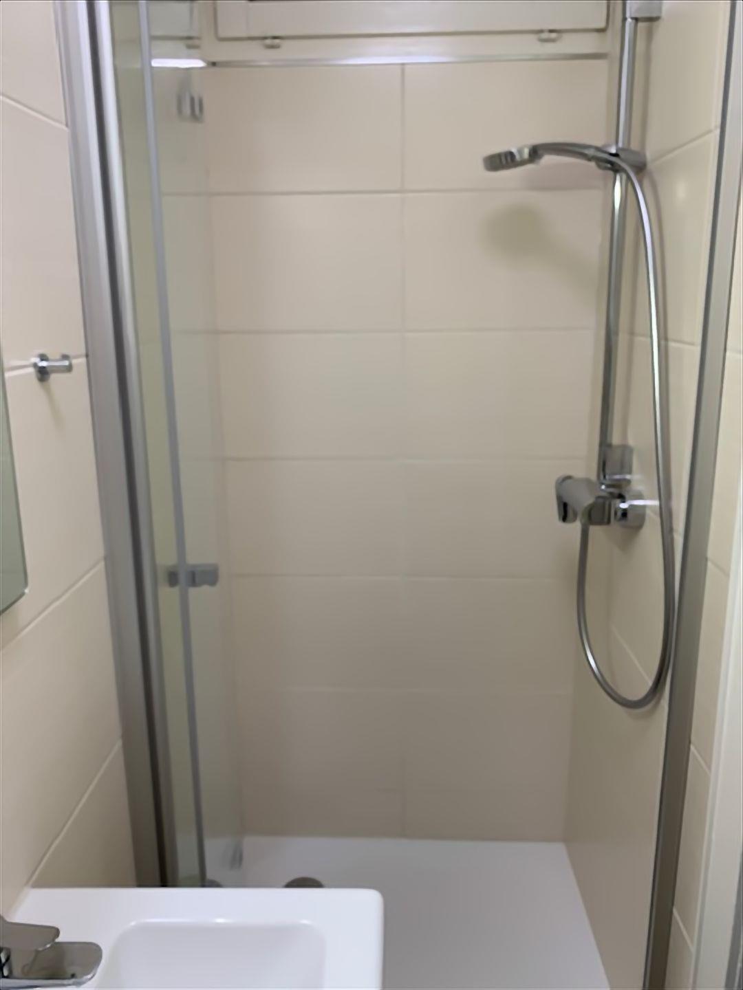Das kleine und neuwertige Badezimmer wurde mit Dusche ausgestattet und verfügt ebenfalls über ein kippbares Oberlicht.
