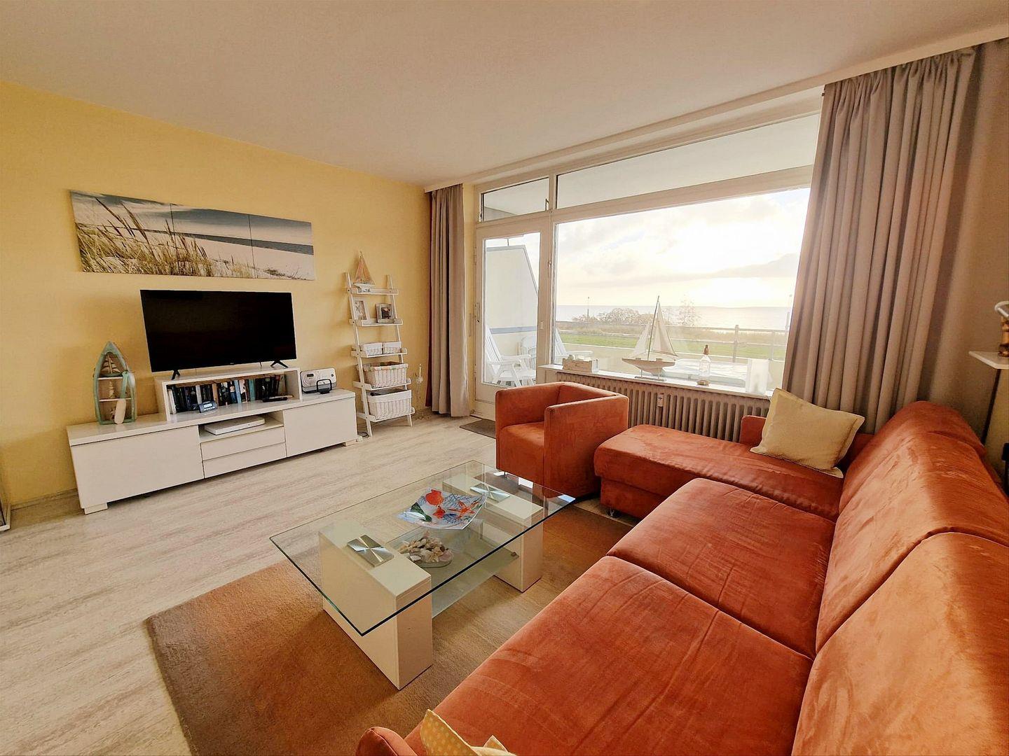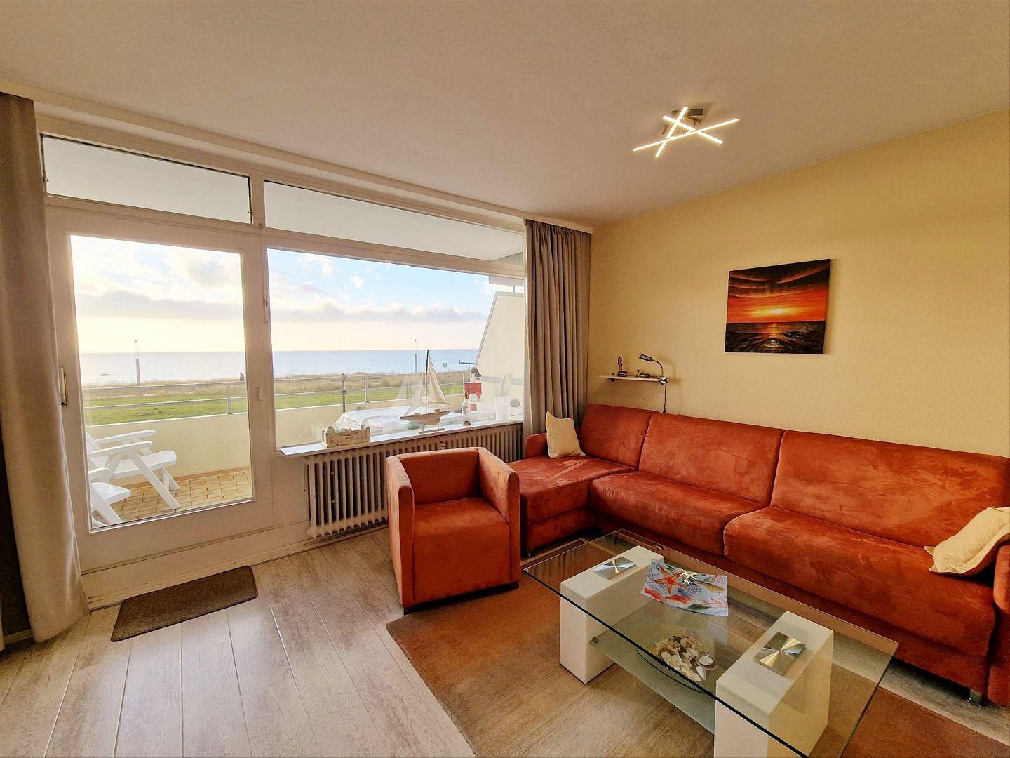 Der helle Wohnbereich mit großer Fensterfront zum Meer ist mit einem Eck-Schlafsofa (1,60 m breit) für 2 Personen, 1 Sessel, einem TV-Gerät und einer Kompaktanlage ausgestattet. In der Essecke bietet ein großer Esstisch Platz für bis zu vier Personen.