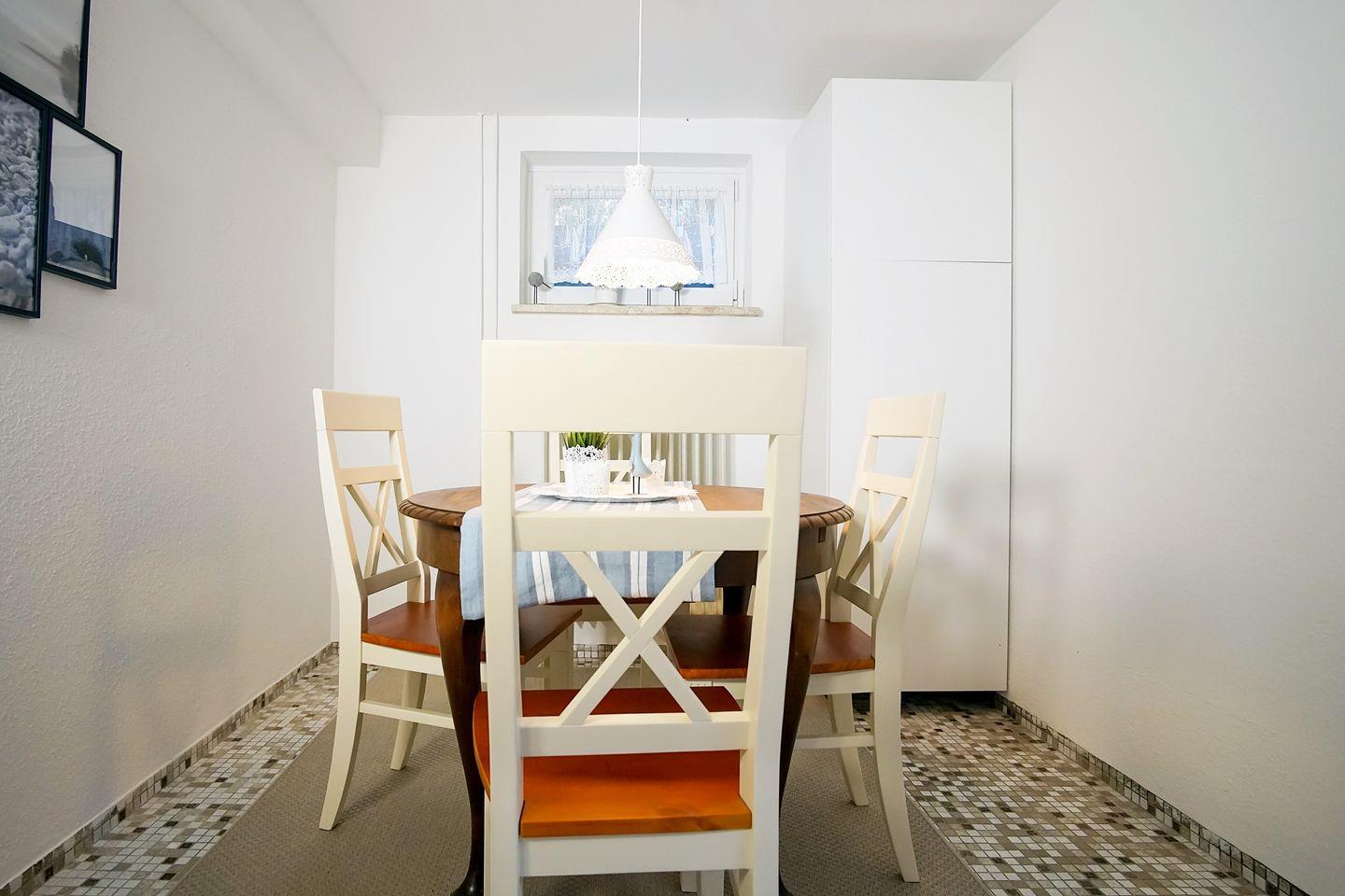 Die Küchenzeile verfügt über Microwelle, Backofen, Kühlschrank mit Tiefkühlfach, Spüle und alle Ausstattungen zum Kochen und Servieren. Die gemütliche Essecke bietet Platz für gemeinsame Mahlzeiten, Spieleabende oder die Planung des nächsten Urlaubstages.