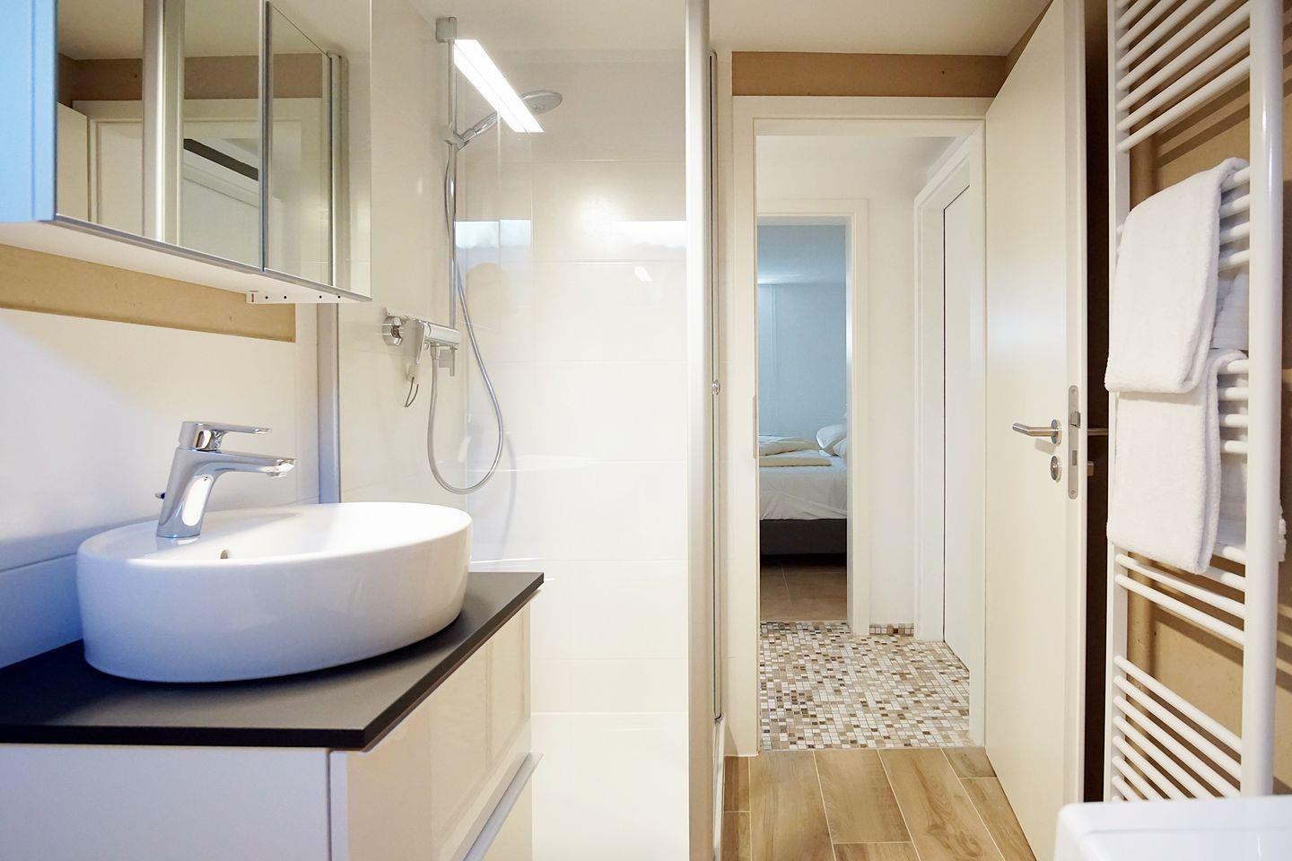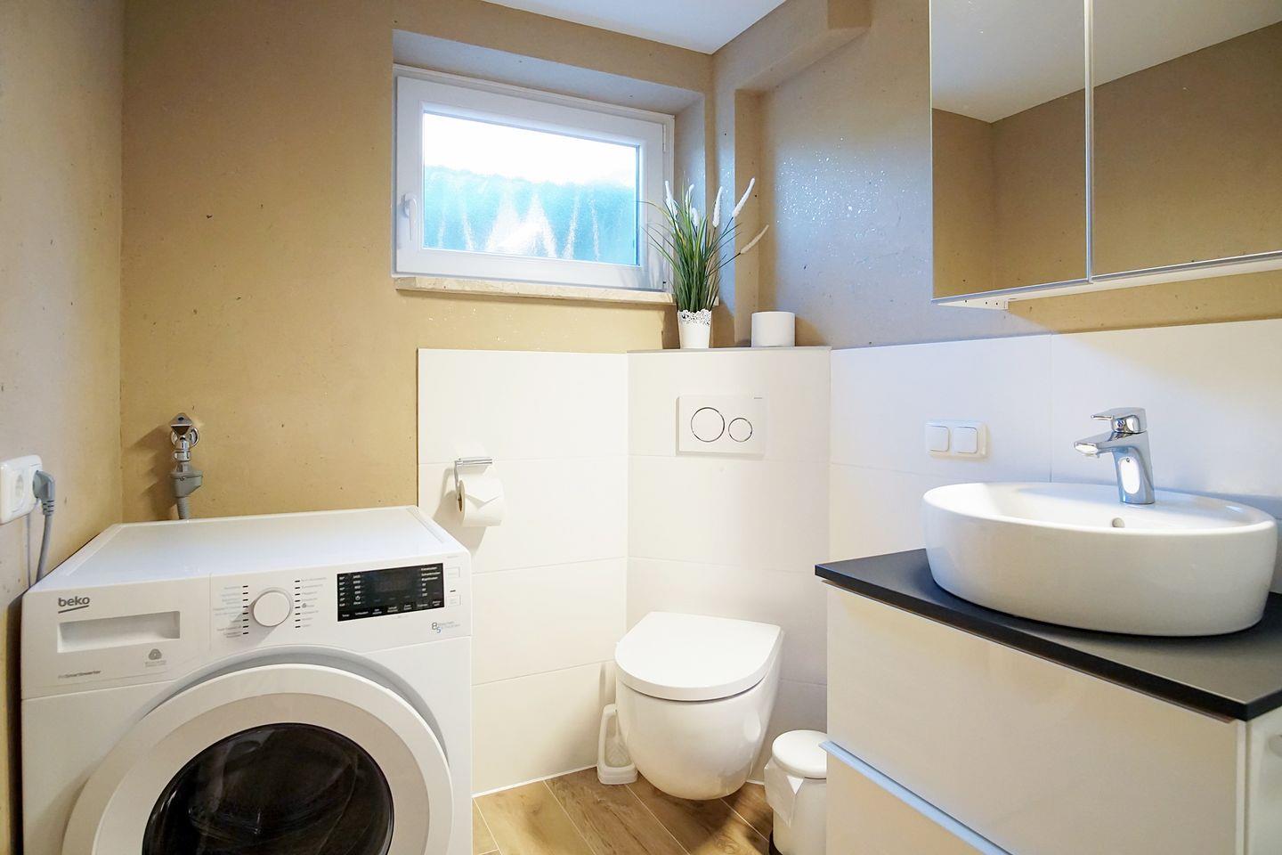 Das Badezimmer ausgestattet mit Fenster und Fußbodenheizung bietet eine Dusche mit niedrigem Einstieg, Waschbecken mit Spiegel und einem Handtuchheizkörper. Hier können Sie auch das Kombigerät den Waschtrockner für Ihre Urlaubsgarderobe nutzen.