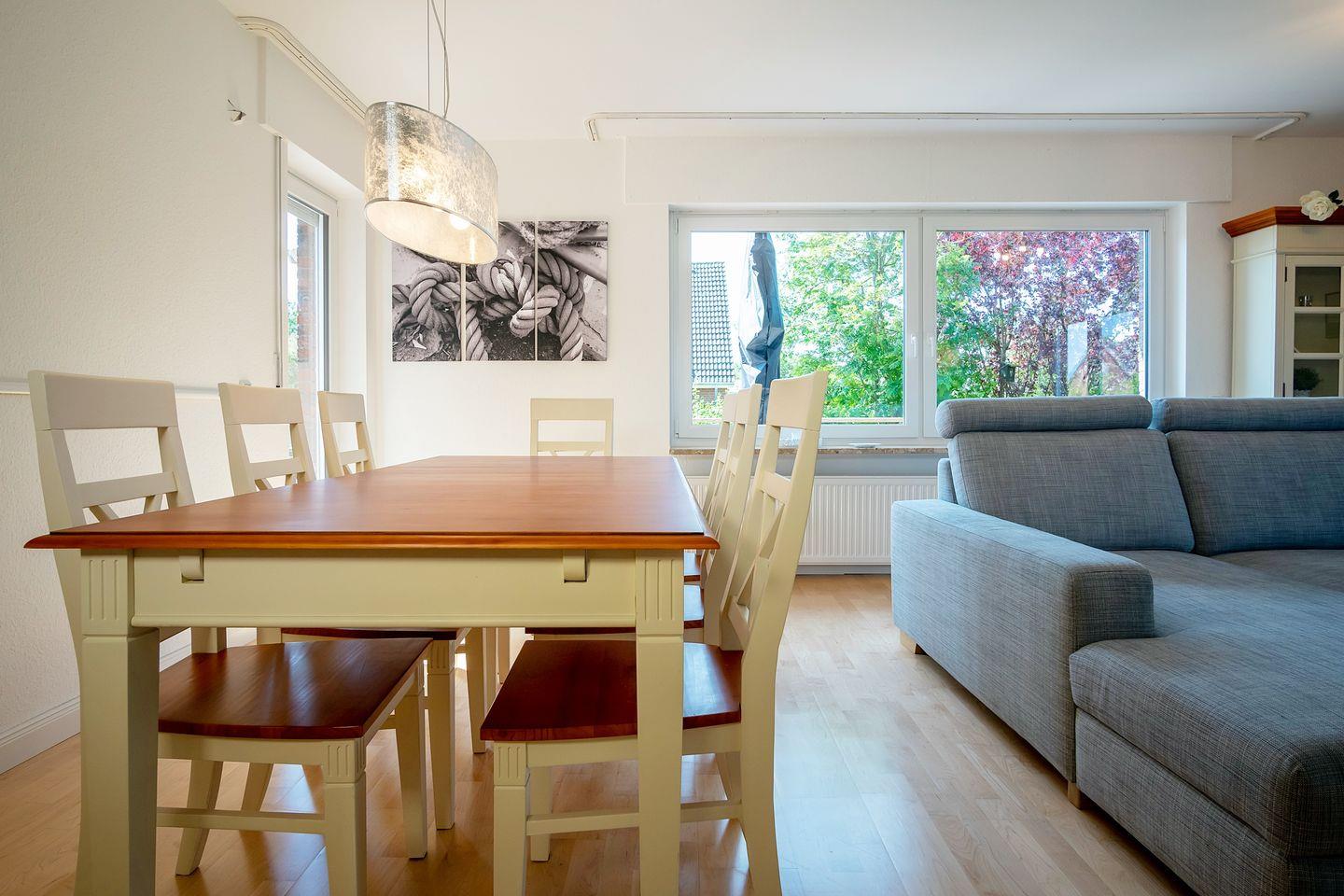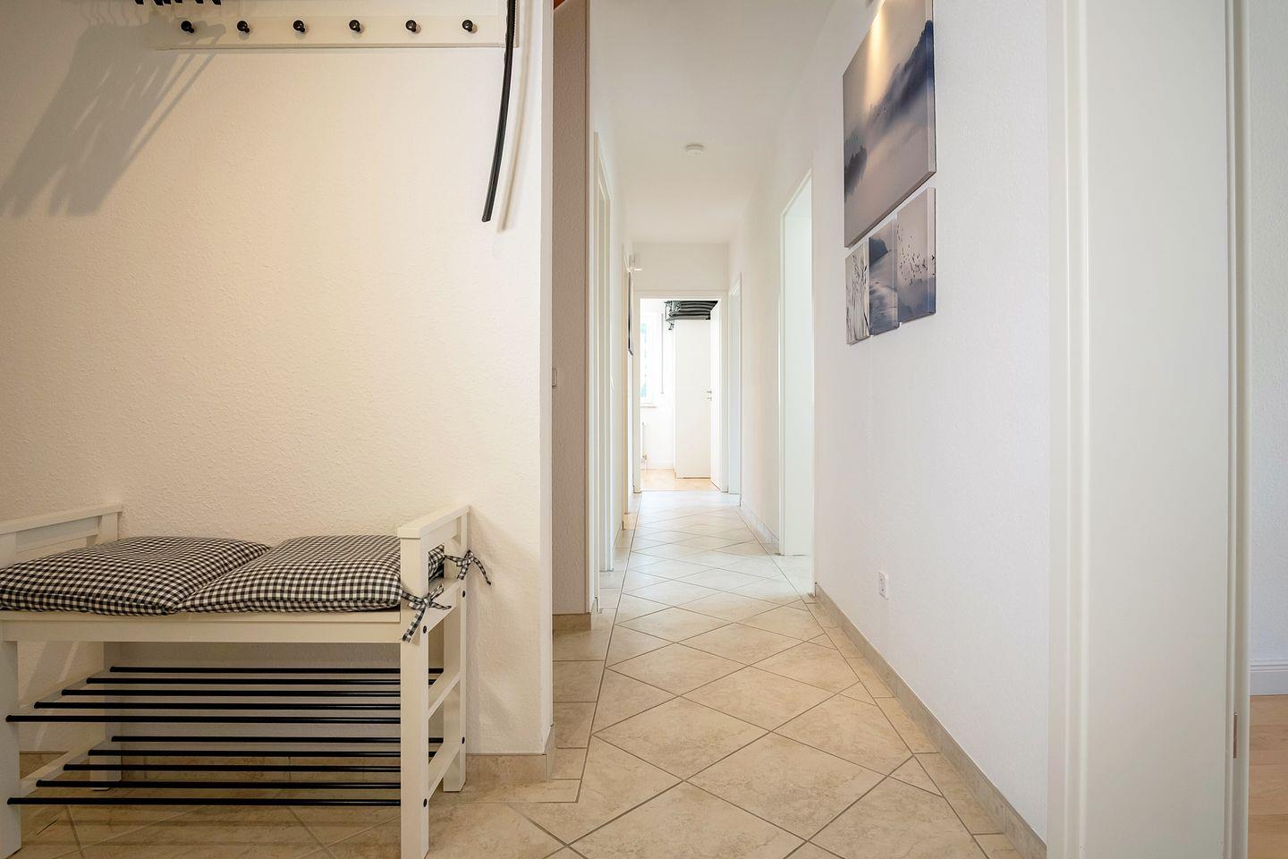 Diese schicke modern eingerichtete Wohnung liegt in einer Sackgassenlage in ruhiger Umgebung im schönen Ort und trotzdem erreichen Sie schnell fußläufig das Meer. Dieses Urlaubsdomizil mit einer Fläche von ca. 100 qm eignet sich hervorragend für 6 Personen und empfängt Sie in Kombination aus Flur, Küche, Wohnbereich und drei Schlafzimmern.