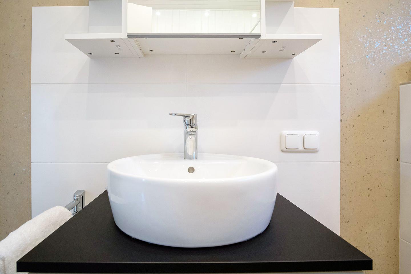 Die zwei Badezimmer mit Fenster bieten eine Dusche mit niedrigem Einstieg, Waschbecken mit Spiegel und einem Handtuchheizkörper, auch hier ist ausreichend Platz für 6 Personen.