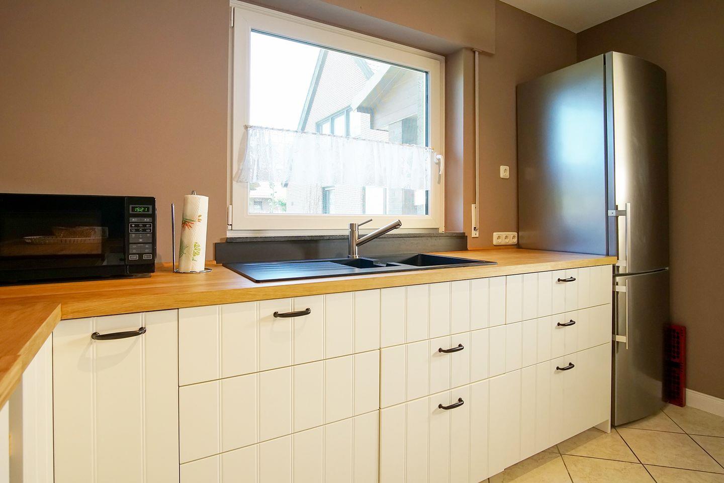 Die voll ausgestattet Küche verfügt über Microwelle, Backofen, Kühl- und Gefrierschrank, Spüle und alle Ausstattungen zum Kochen und Servieren. Die große gemütliche Essecke bietet Platz für gemeinsame Mahlzeiten, Spieleabende oder die Planung des nächsten Urlaubstages.