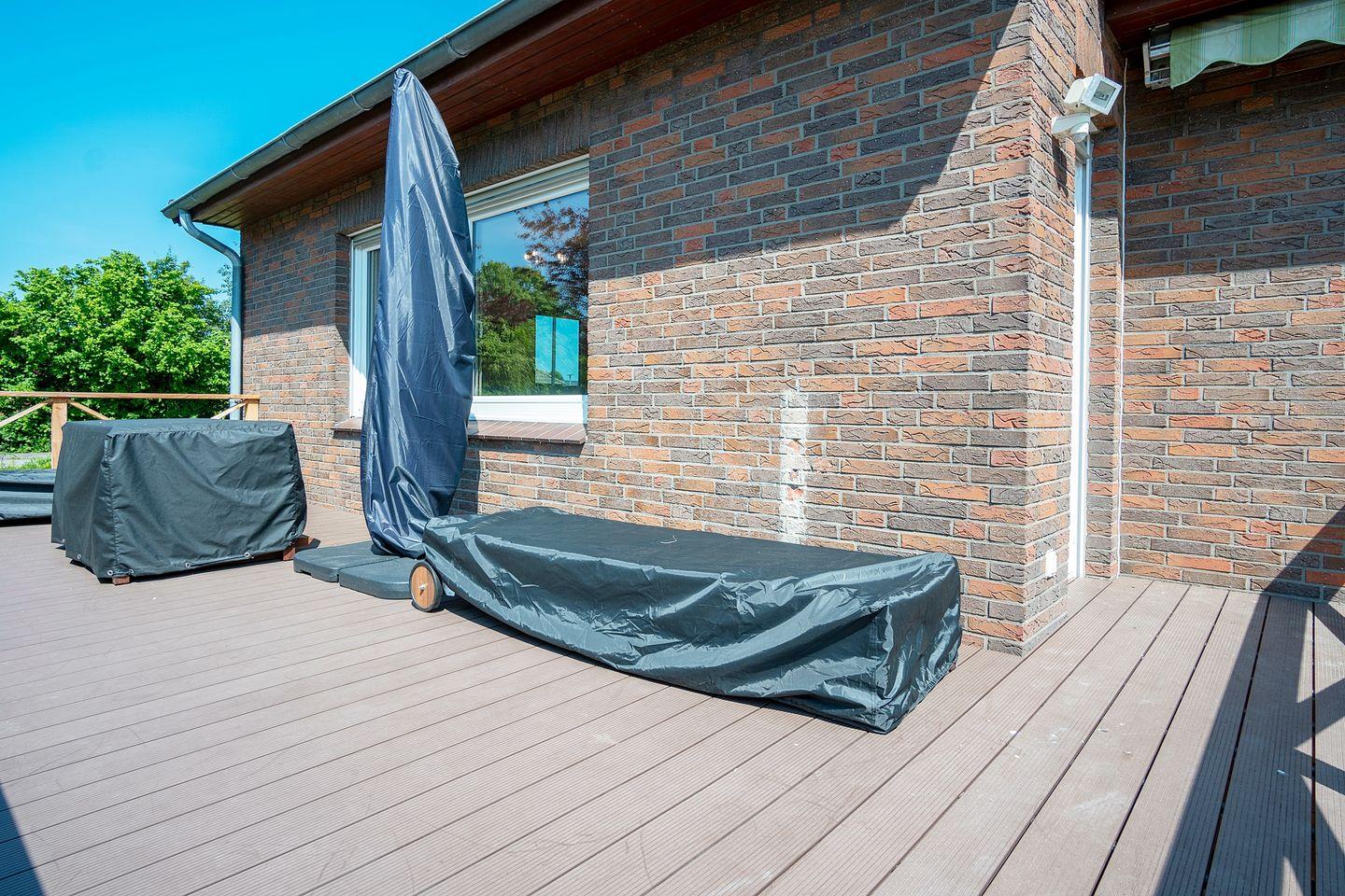 Besonders hervorzuheben ist die traumhafte Terrasse, welche aufgrund der guten Sonnenlage den ganzen Tag zum Sonnenbaden einlädt. Hier stehen für Sie Gartenmöbel, ein große Markise und Relax-liegen bereit, der vorhandene Grill rundet das Angebot für einen chilligen Sommerabend ab. Das ganze Haus bietet ausreichend Sichtschutz durch die vorhandenen Jalousien und Rollläden.