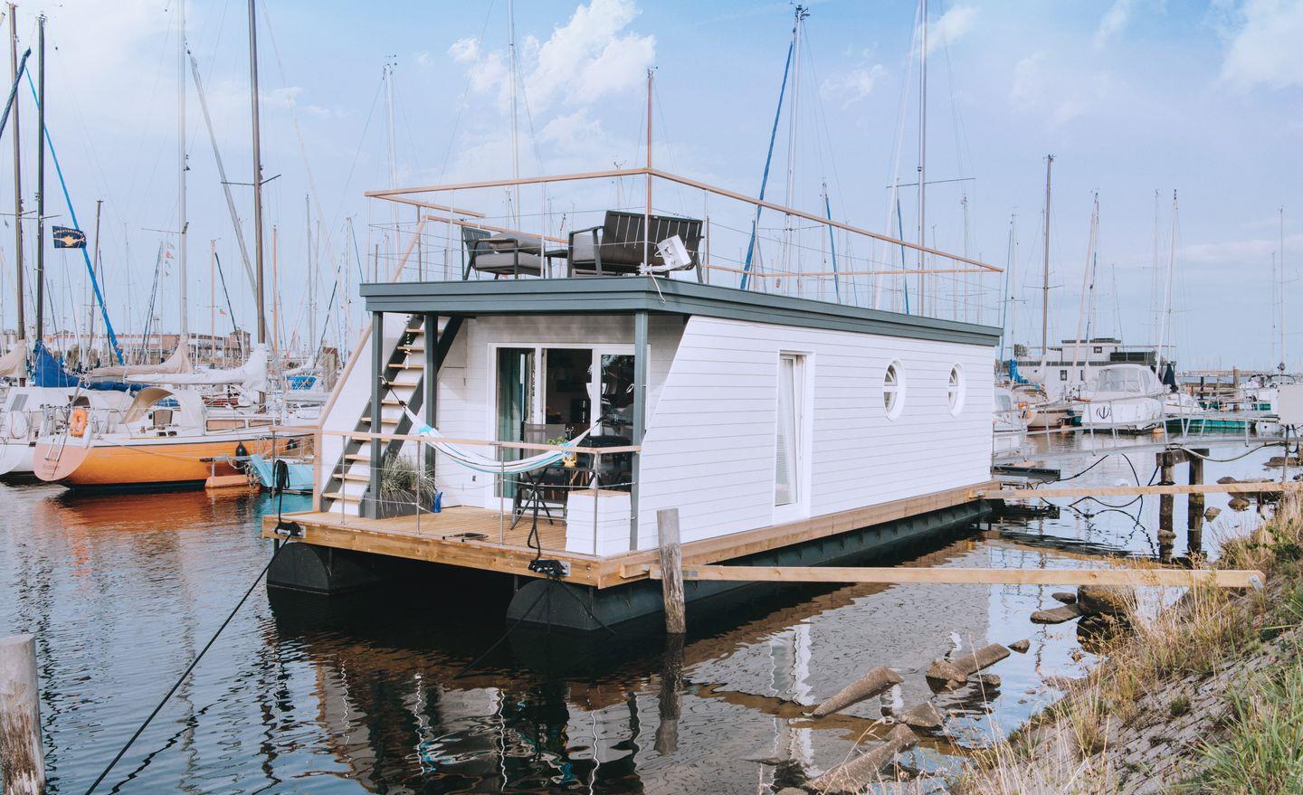 Das Hausboot Fiete unsHusboot liegt direkt in der idyllischen Marina Großenbrode und bietet maritimes Flair in der ersten Reihe.