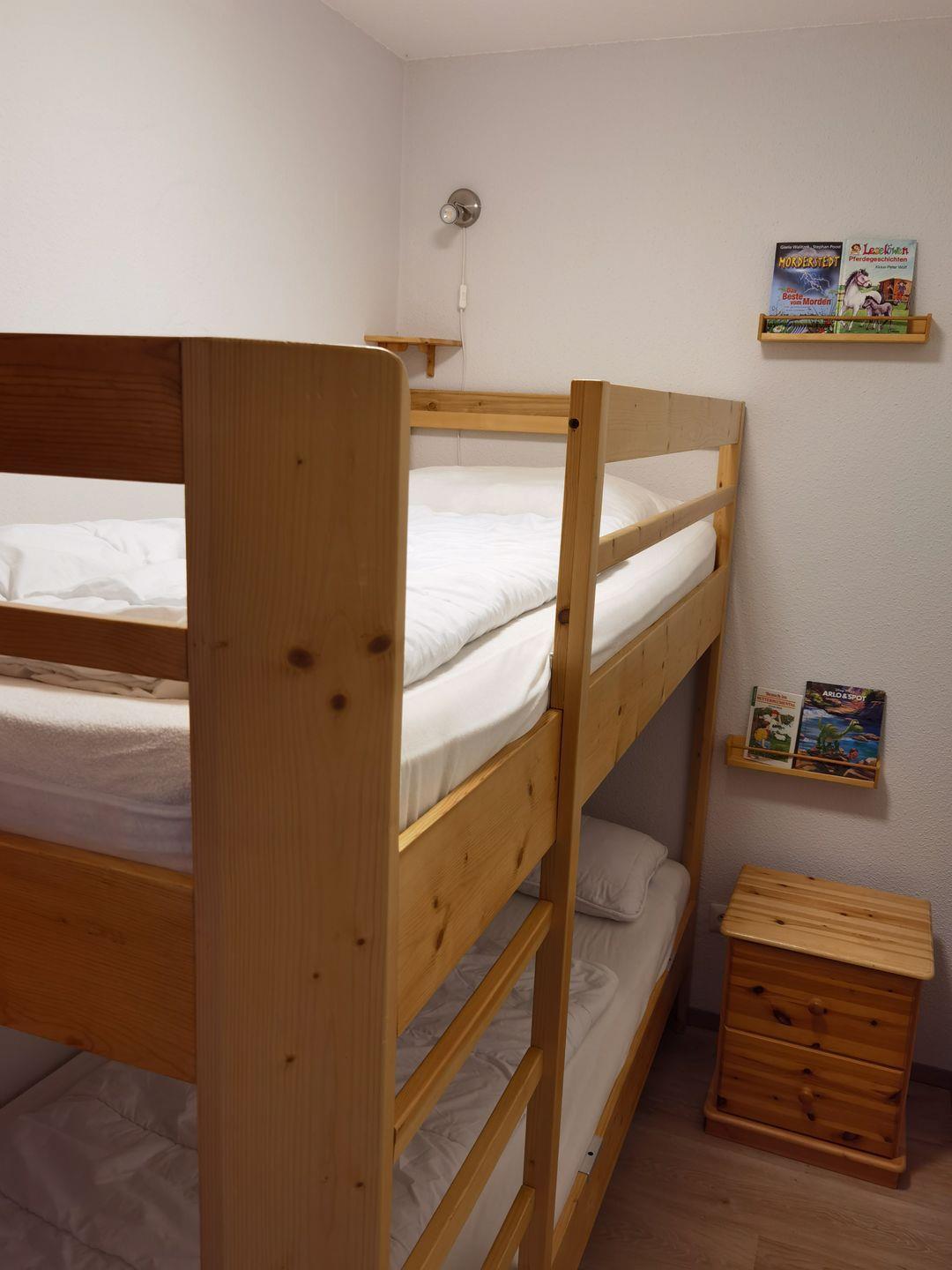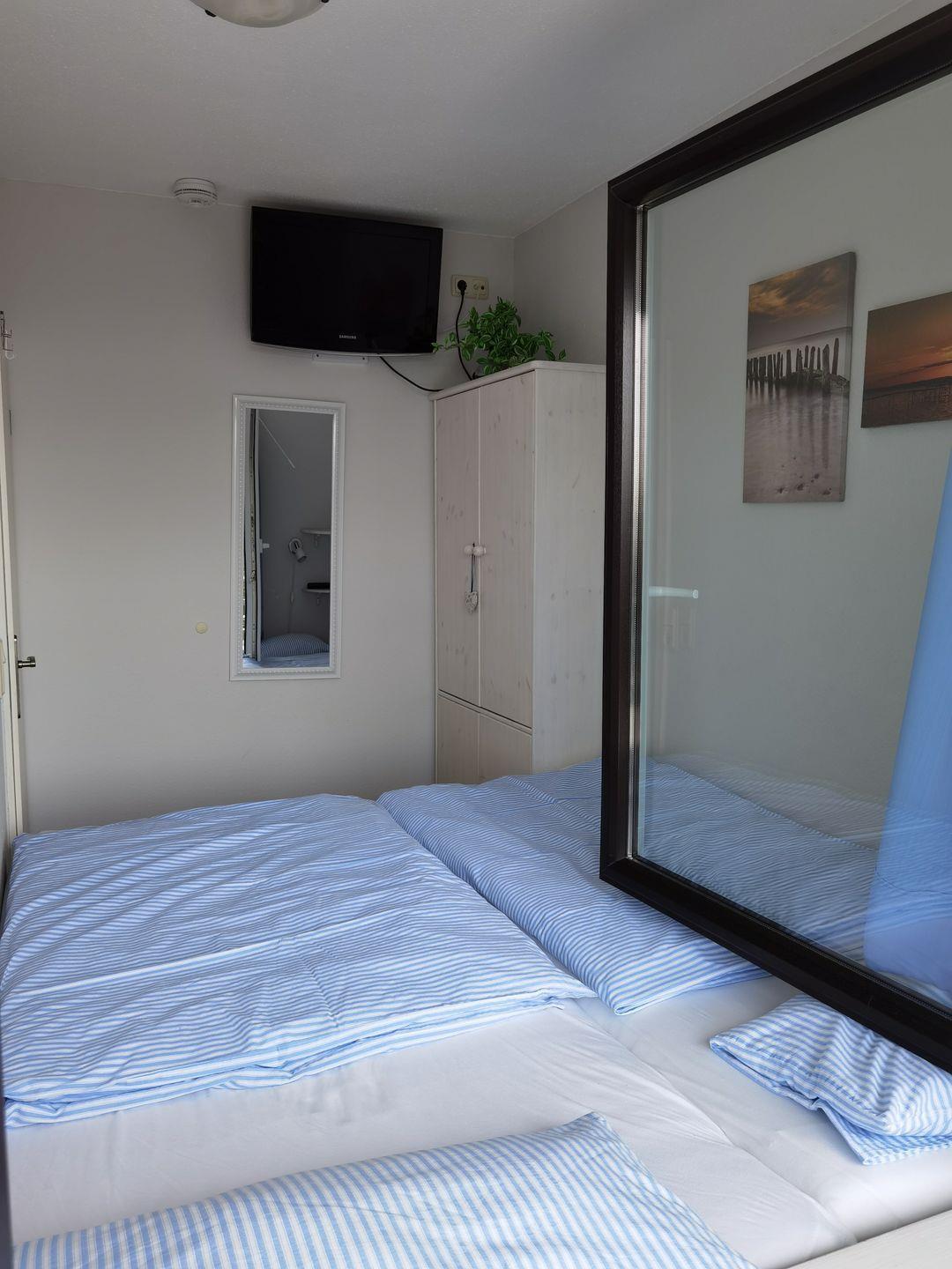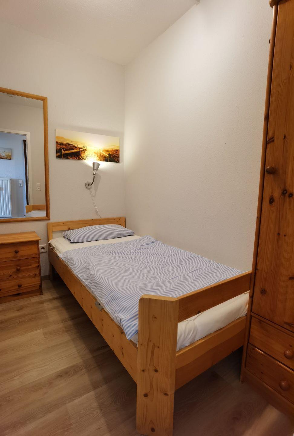 In dem separaten Schlafzimmer mit Ausblick auf den gesamten Südstrand mit Promenade und einem zweiten TV befindet sich ein Doppelbett und ein Kleiderschrank.Die Besonderheit an dieser Wohnung ist die gute Aufteilung und die Verfügbarkeit von noch zwei weiteren Schlafzimmern. Ein Schlafbereich hält ein Etagenbett vor und das zweite Schlafzimmer verfügt über ein Einzelbett.