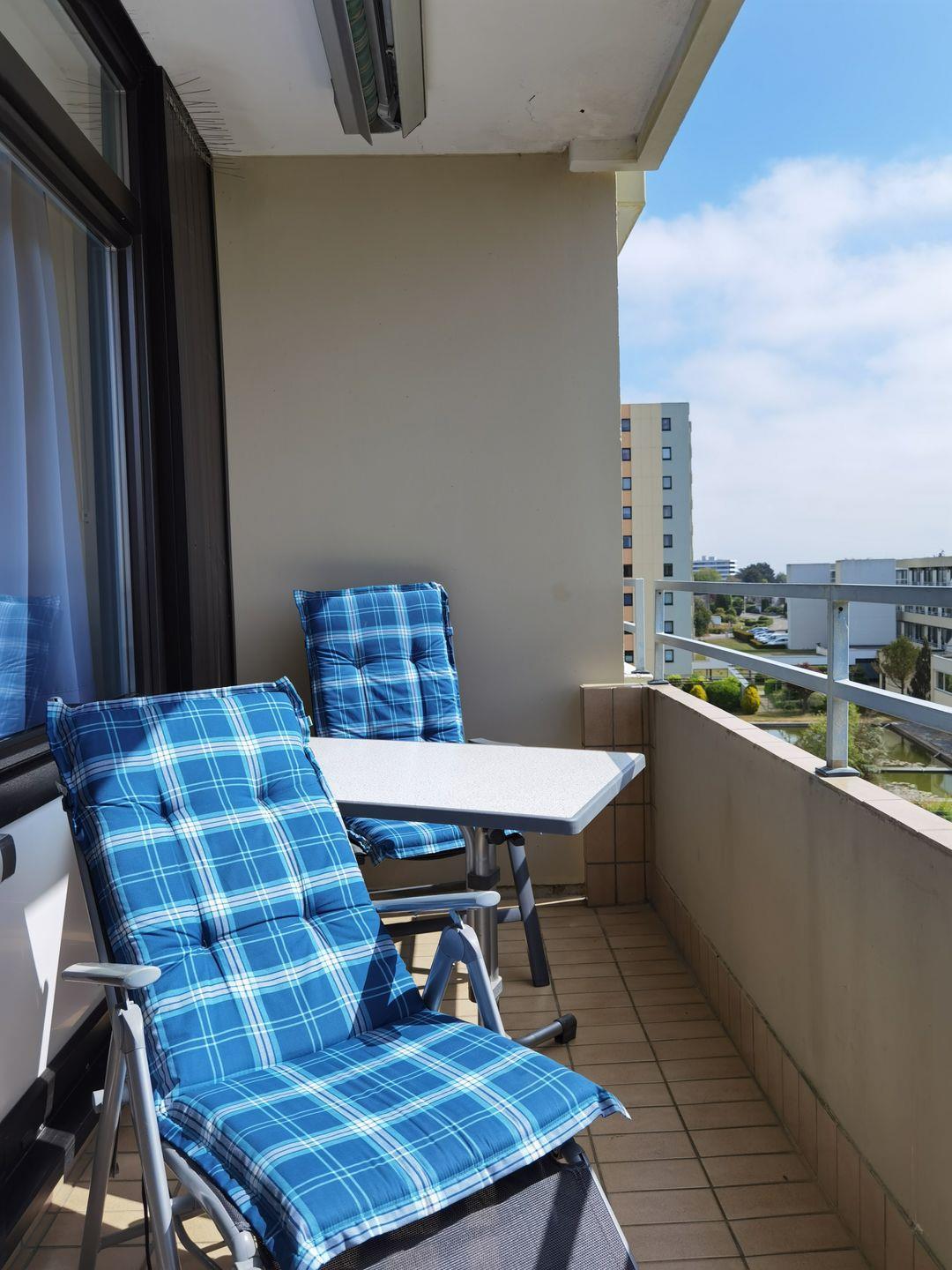 Vom Südbalkon genießen Sie aus dem 3. Stock den direkten, atemberaubenden Blick auf das glitzernde Meer zu Ihren Füßen. Gemütliche Hochlehner mit Polsterauflagen und ein Tisch laden zum Entspannen, Krafttanken und Sonnen ein.