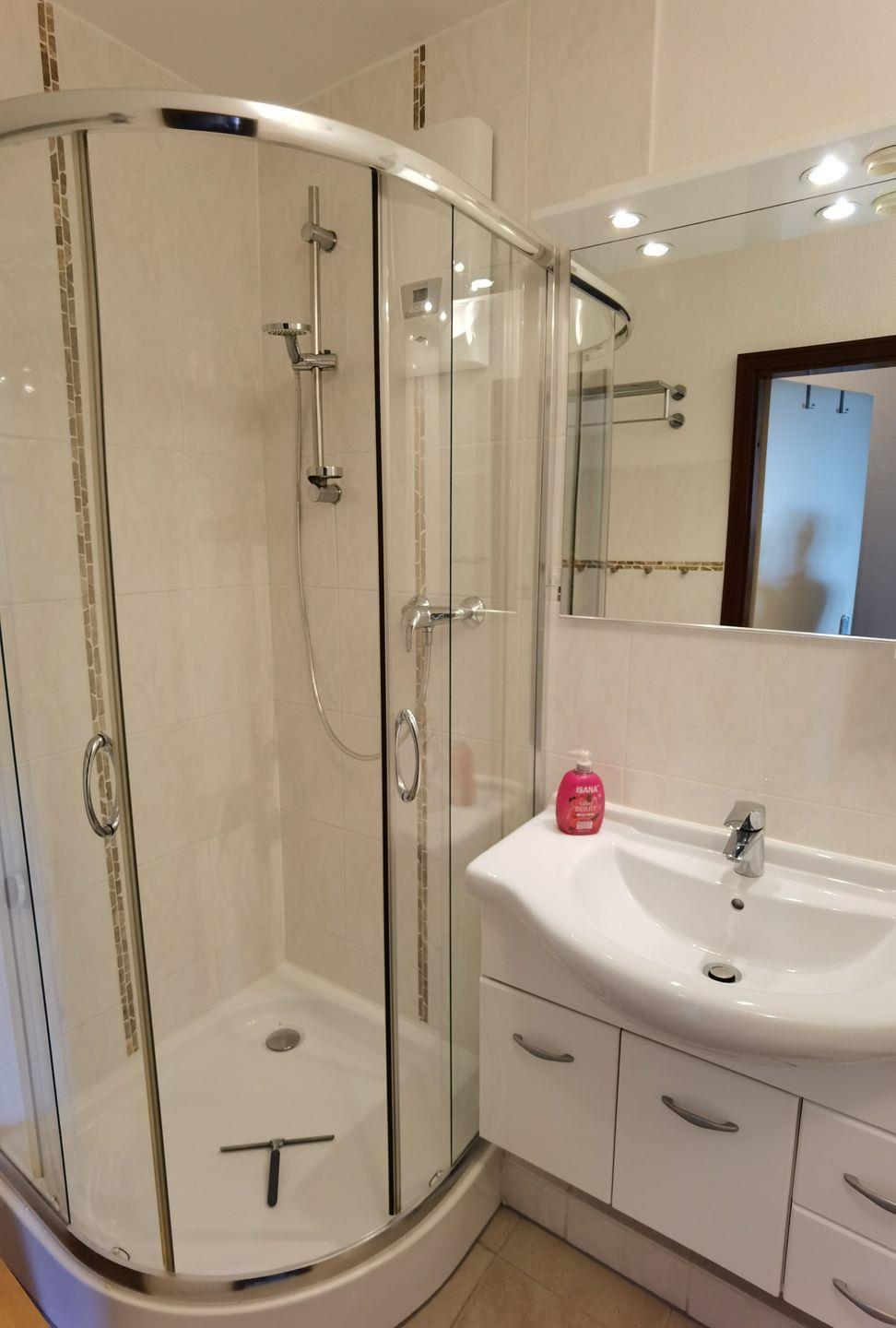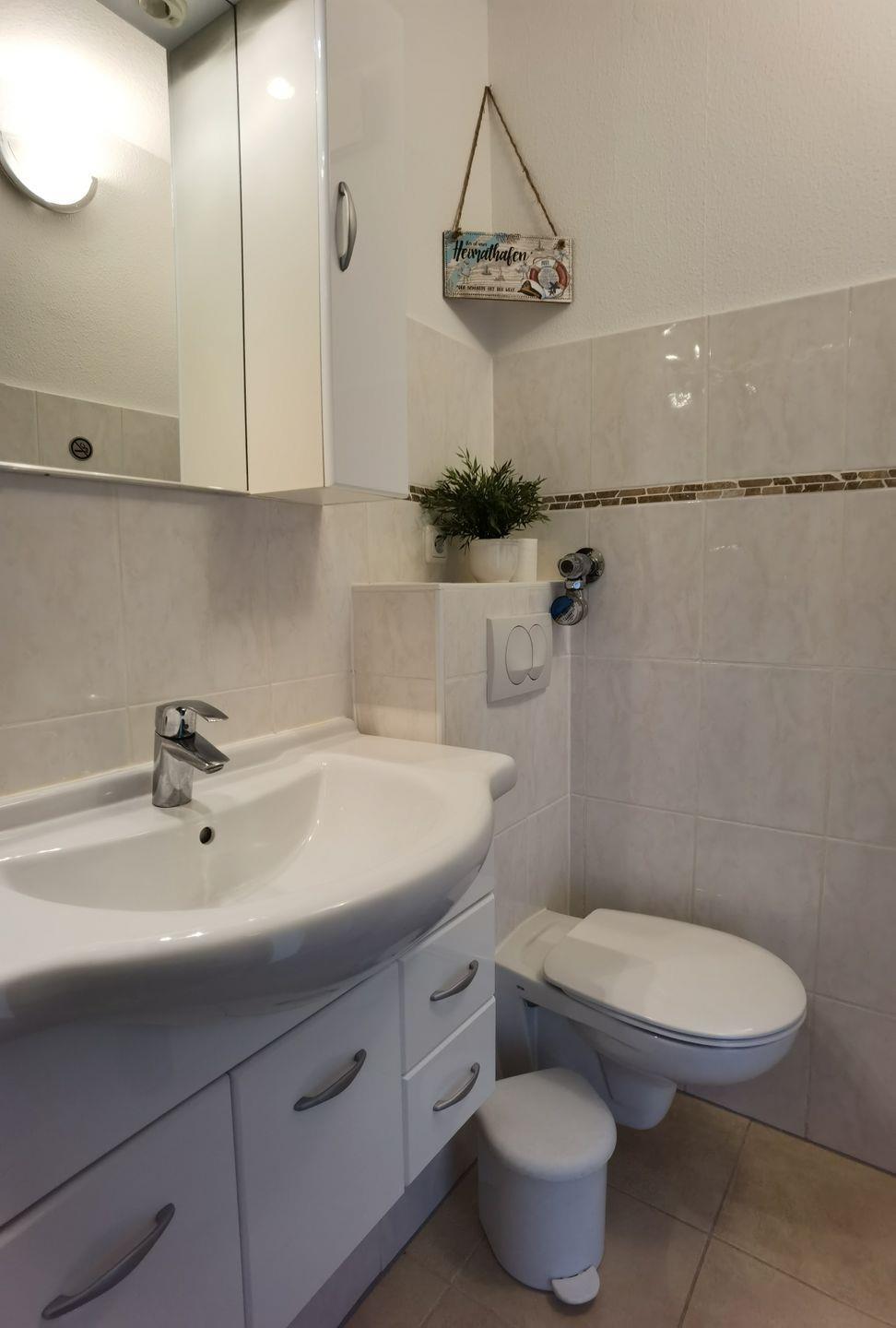 Das innenliegende Duschbad verfügt über einen beleuchteten Spiegelschrank, Waschbeckenunterschrank mit ausreichend Stauraum und eine Dusche mit Wanne.