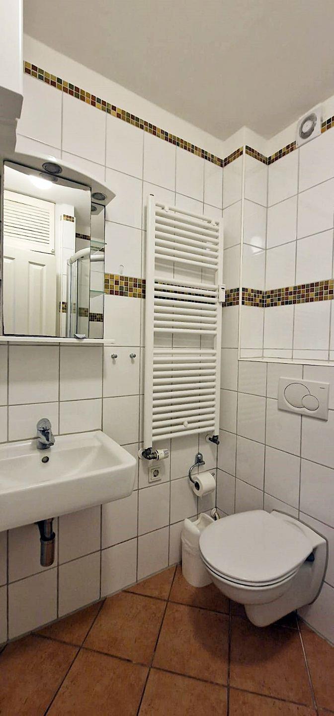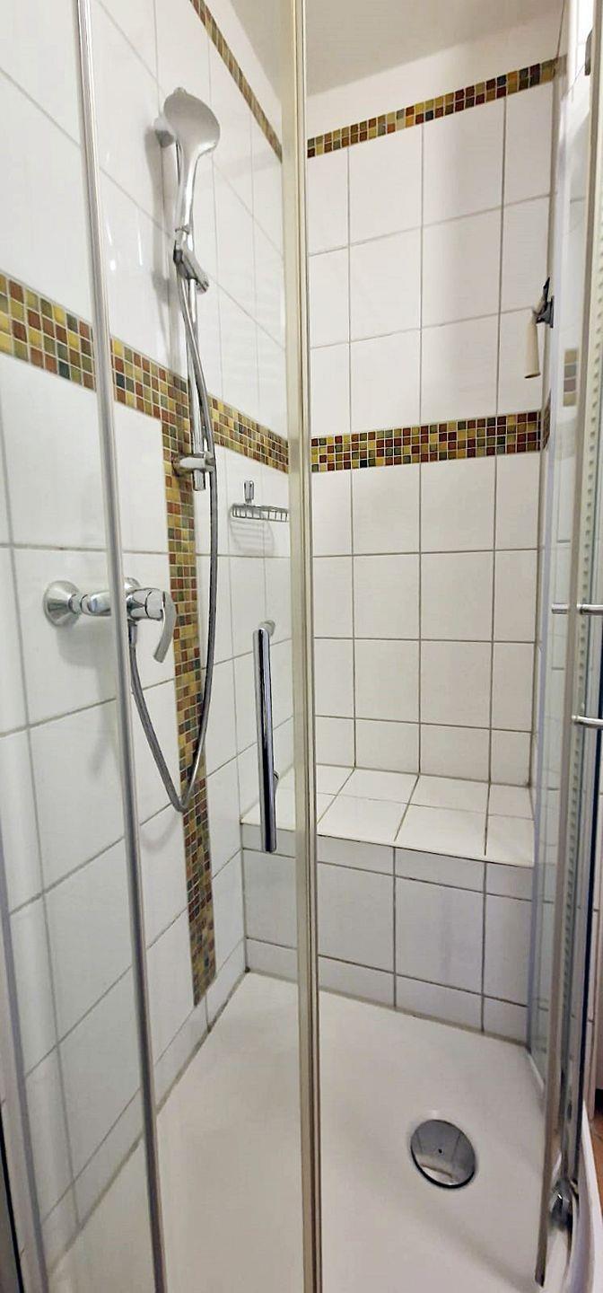Das Badezimmer wurde ebenfalls modernisiert: die Dusche verfügt über einen niedrigen Einstieg und ist mit einer Glastrennwand ausgestattet.