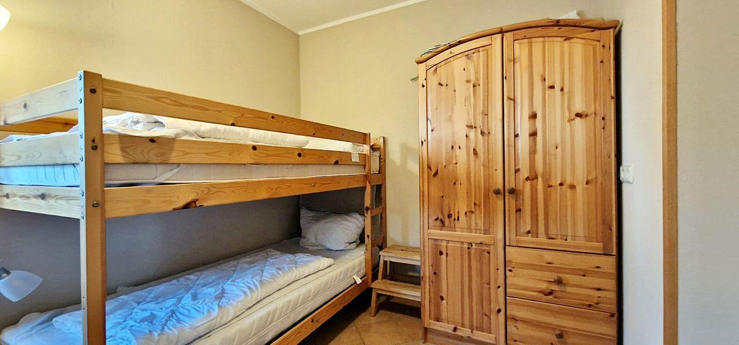 Das Schlafzimmer wurde mit einem Doppelbett und einem geräumigen Kleiderschrank für ihre Urlaubsgarderobe ausgestattet. Das Kinderzimmer ist mit einem Etagenbett und einer Schlafcouch eingerichtet. Beide Räume lassen sich abdunkeln, so dass einer geruhsamen Nacht nichts im Weg steht.