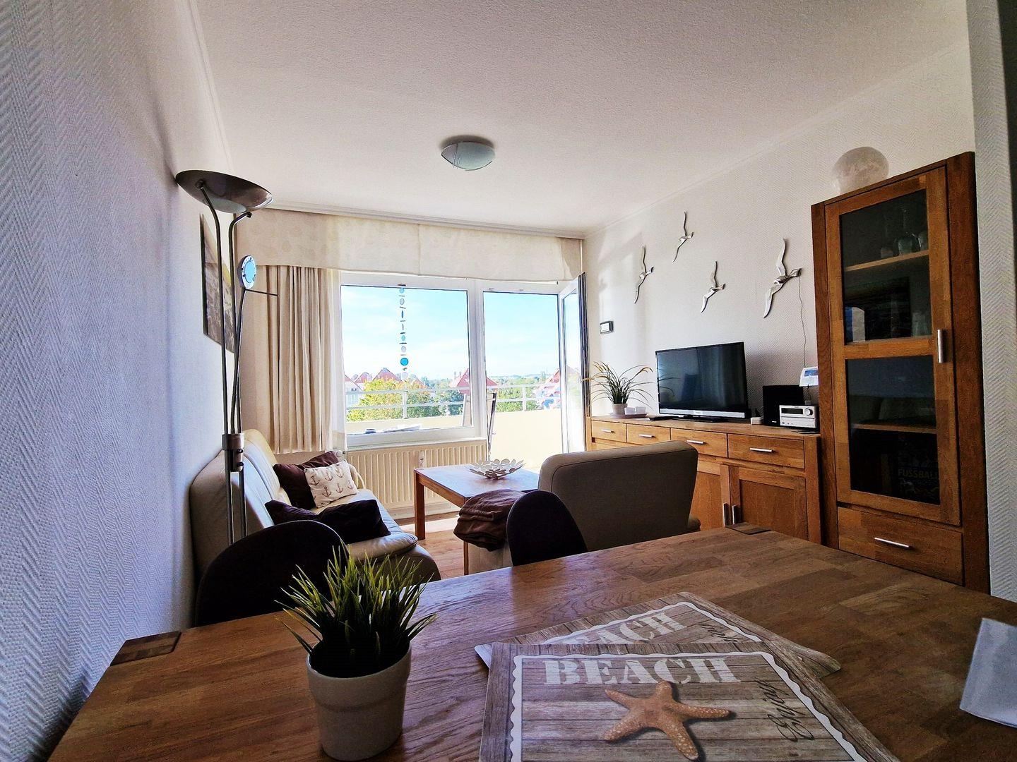 Vom möblierten Balkon mit Sitzgelegenheiten haben Sie einen seitlichen Blick aufs Meer und von mittags bis abends können Sie hier ein sonniges Plätzchen einnehmen.
