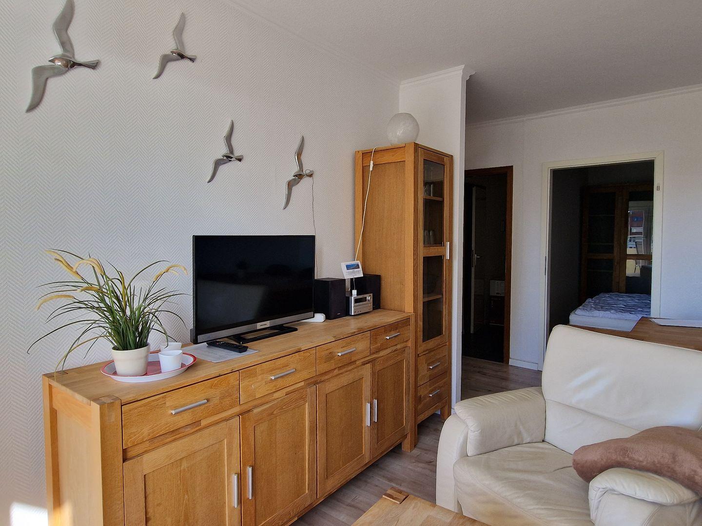 Im kombinierten Wohn/-Ess-/ und Schlafzimmer steht ein gemütliches Sofa, ein Sessel, eine Anrichte sowie ein Flachbild Fernseher zur Verfügung. Ein großer Esstisch bietet ausreichend Platz für gemeinsame Mahlzeiten und Spieleabende oder planen Sie hier die nächsten Urlaubsausflüge. Ein großes, gemütliches Doppelbett sowie ein Kleiderschrank stehen für Sie bereit. Für etwas mehr Privatsphäre wird der Schlafbereich optisch vom Wohnbereich getrennt.