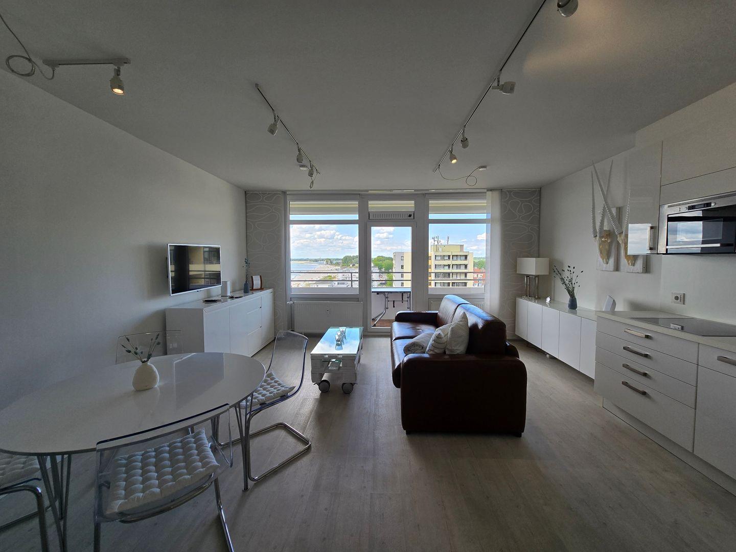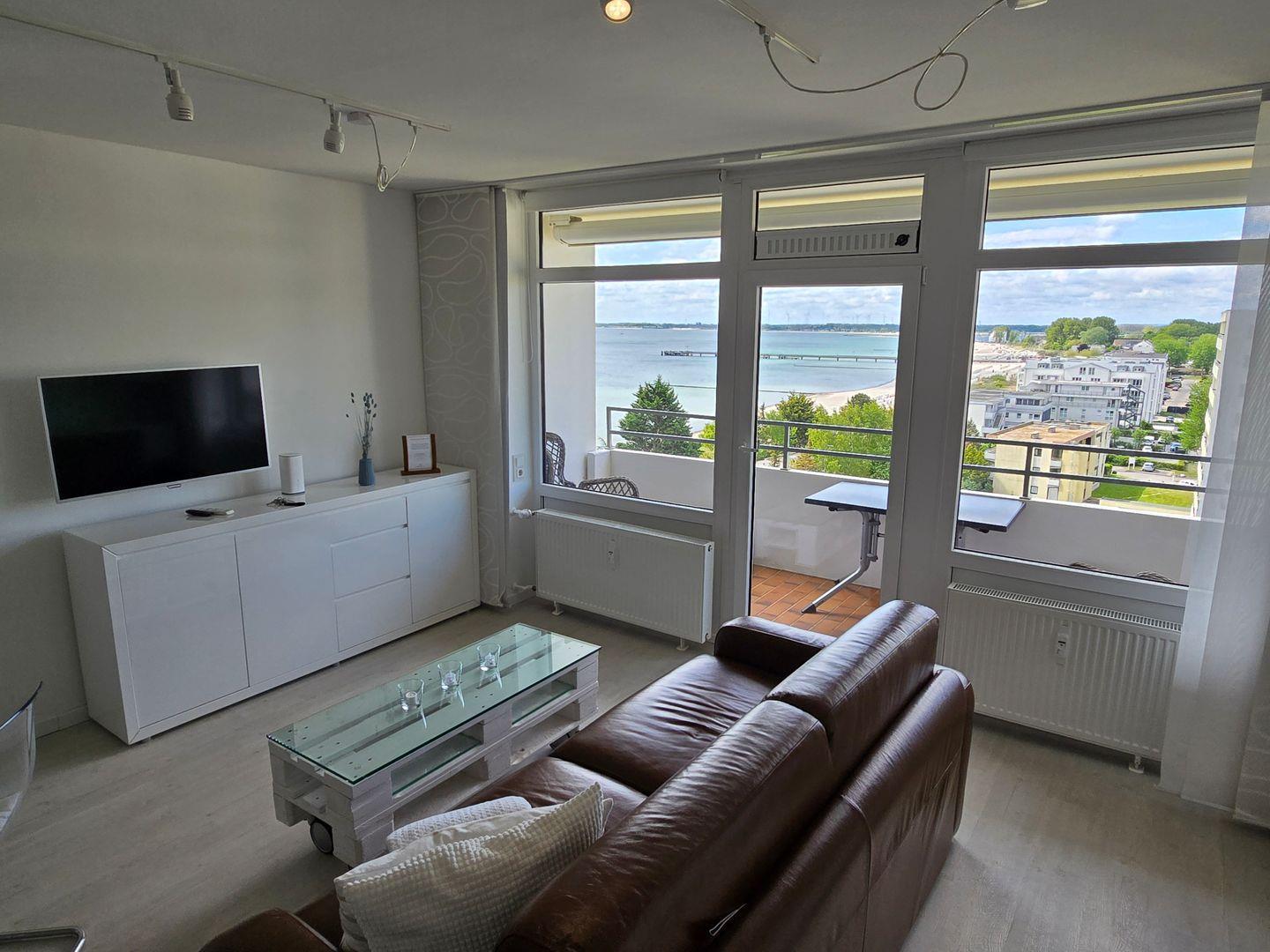 Im Wohnbereich wartet ein gemütliches Sofa mit tollem Blick auf die Ostsee auf Sie. Der große Flachbildfernseher bietet Unterhaltung und wurde oberhalb eines geräumigen Sideboards angebracht. Der runde Essplatz lädt ebenfalls zum Verweilen ein. Hier lassen sich entspannt ihre zubereiteten Mahlzeiten einnehmen.
