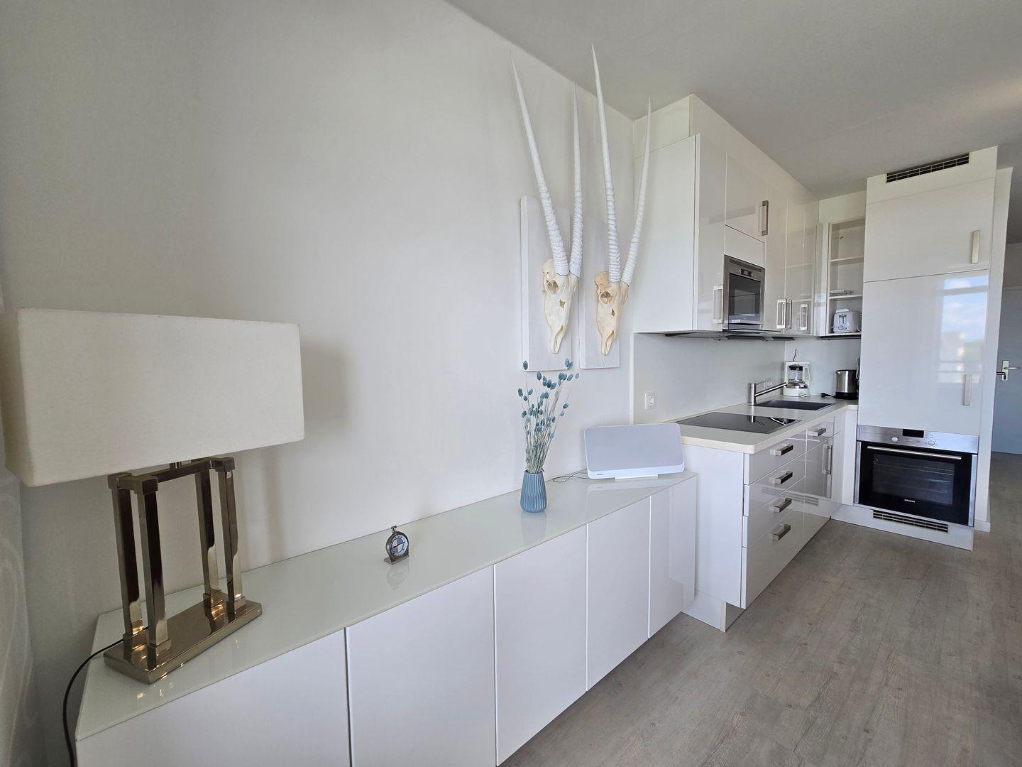 Vom süd-west ausgerichteten möblierten Balkon mit herrlichem Ausblick über den gesamten Südstrand, die Promenade und das Meer genießen Sie die Sonne von mittags bis abends. Eine Markise bietet Ihnen hier einen hervorragenden Sonnenschutz.