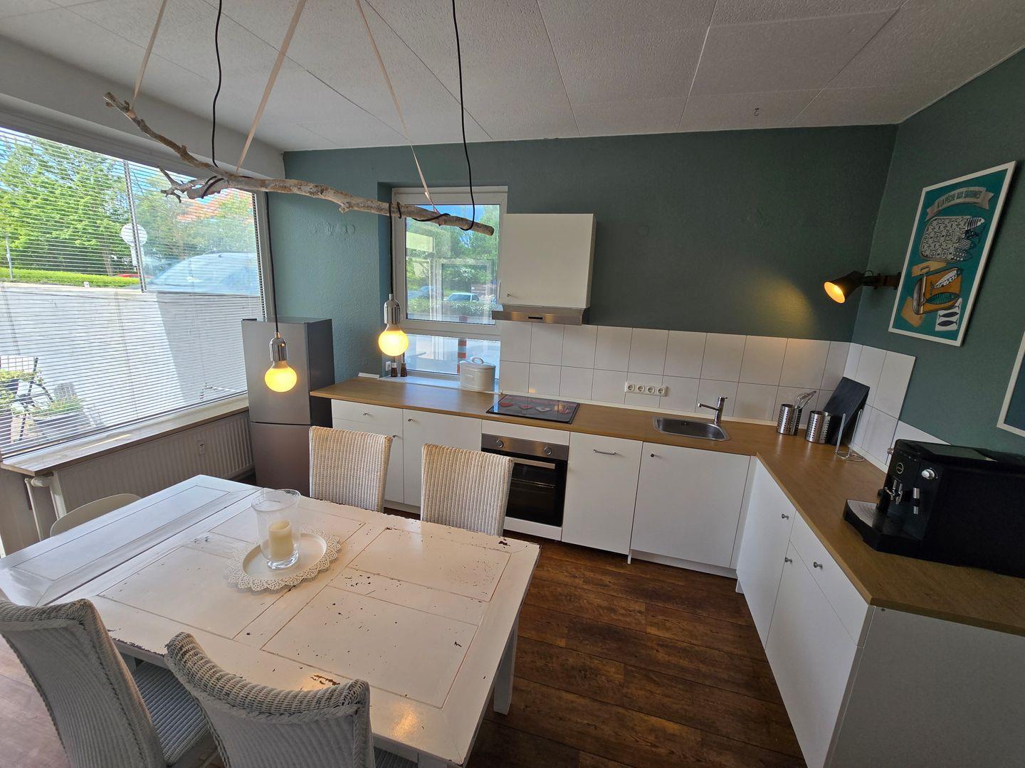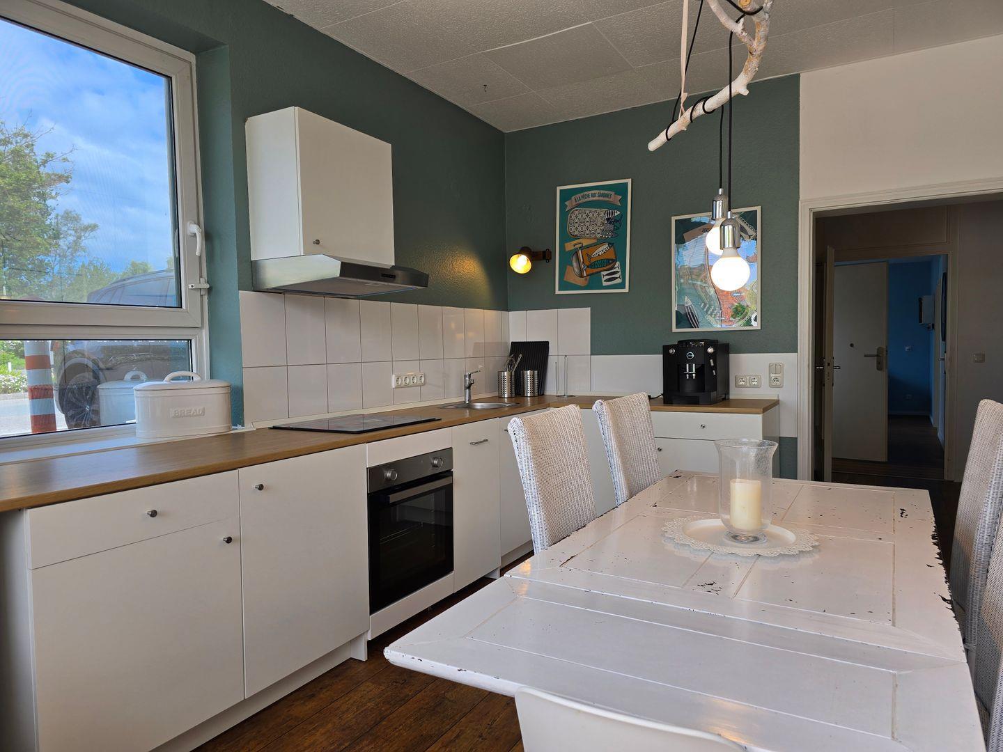 Die anschließende, neue Einbauküche ist umfassend eingerichtet und verfügt über einen Geschirrspüler, Induktionsfeld, Backofen, Kühlschrank und separaten Gefrierschrank sowie Ausstattung zum Kochen und Servieren. Am großen Esstisch finden alle Gäste für gemeinsame Mahlzeiten oder entspannte Spieleabende Platz.