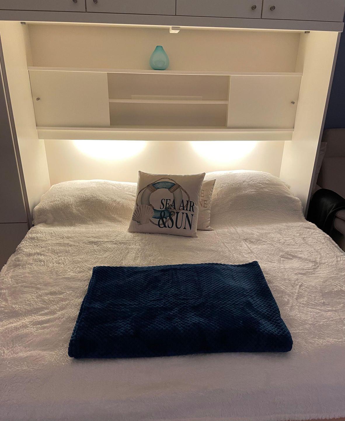 Das Doppelbett (2*90*200) befindet sich in der großen Schrankwand, welches sich für geruhsame Nächte leicht ausklappen lässt. Für eine Abdunklung des Raumes sorgen elektrische Rollläden am Fenster.
