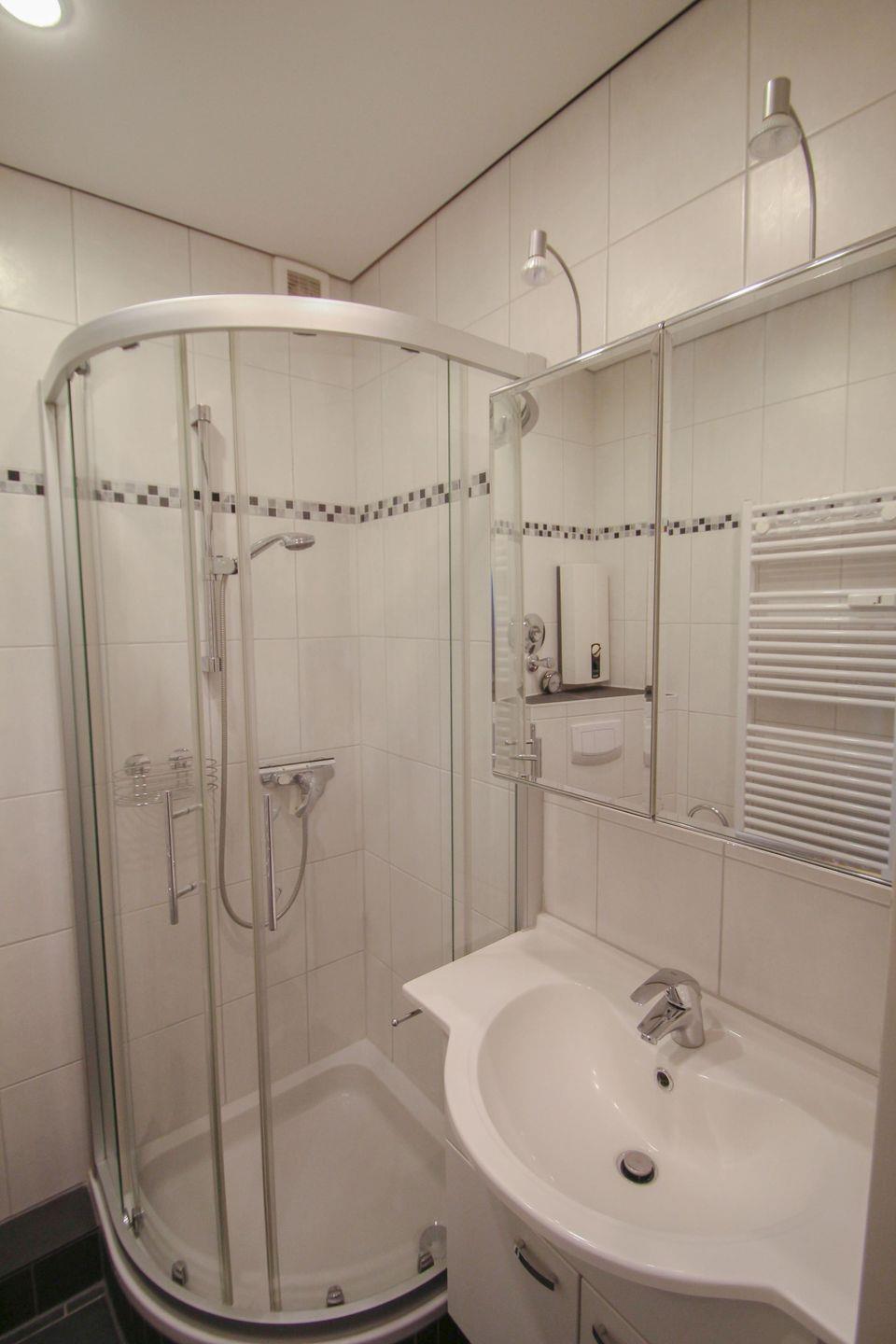 Das Badezimmer verfügt über eine Dusche mit Wanne, WC, Waschbecken und Spiegel. Auch ein Haartrockner ist vorhanden. Für weitere Annehmlichkeiten stehen Ihnen Staubsauger, Bügeleisen sowie gemeinschaftlich genutzte Waschmaschine und Trockner zur Verfügung.