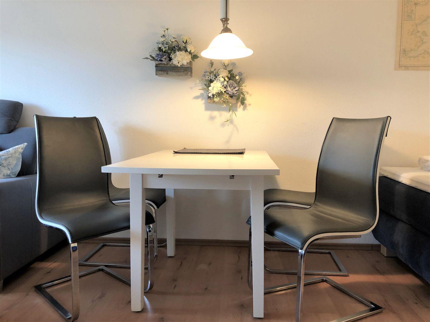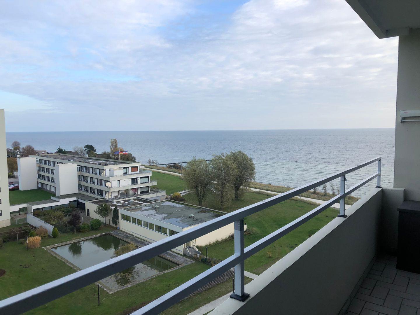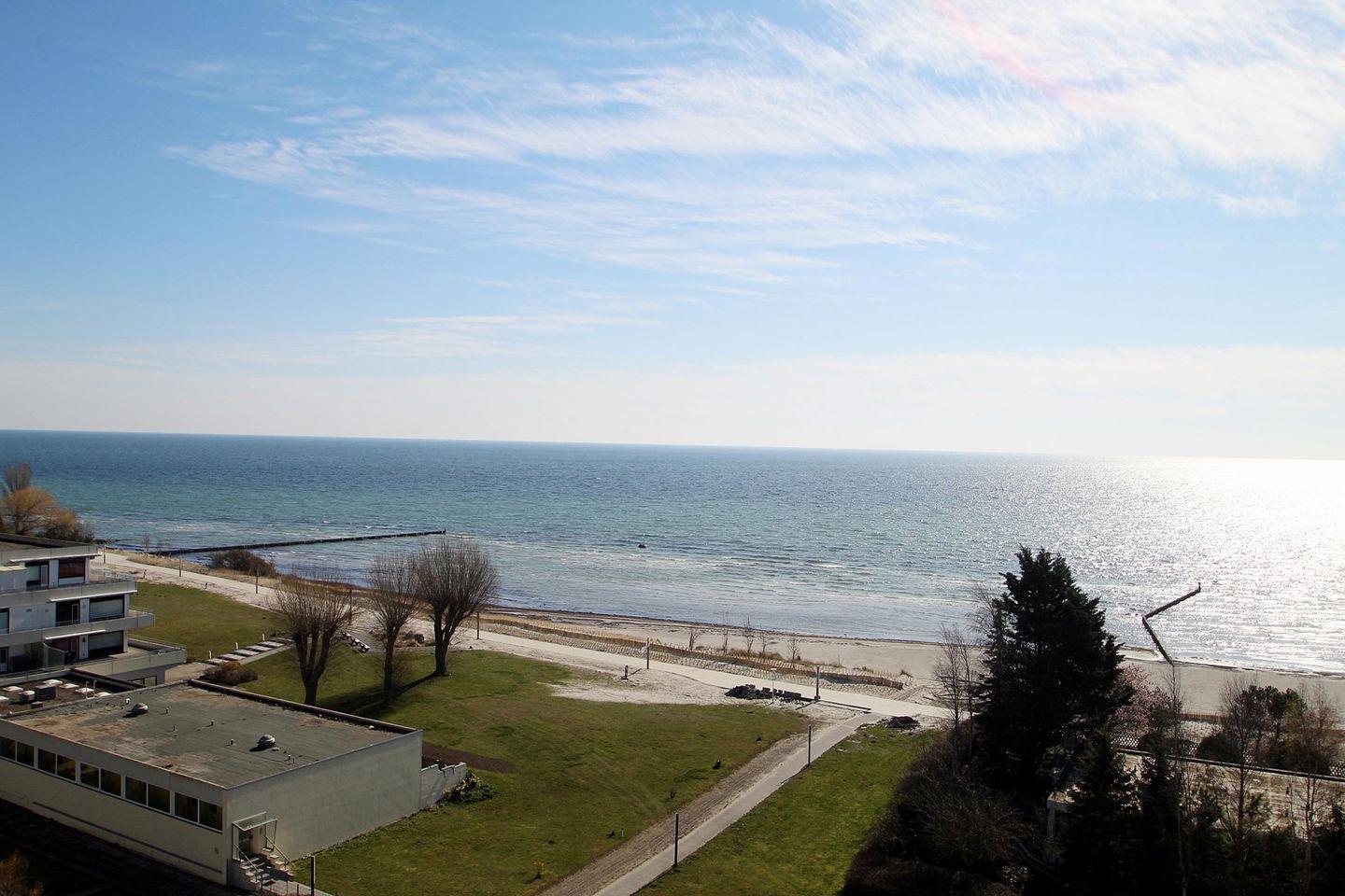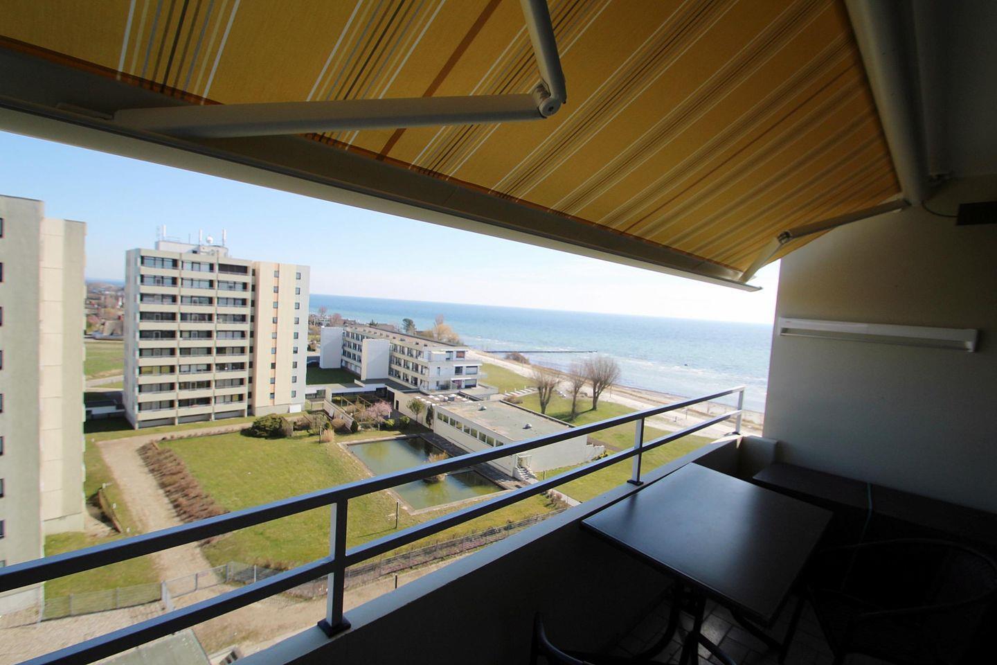dem liebevoll renovierten Zwei-Zimmer-Appartement für max. vier Gäste mit Blick aus dem 7. Stock Richtung Insel Fehmarn. Auf dem Balkon können Sie bei Morgensonne Ihr Frühstück bei seitlichem Meerblick genießen. Gegen zu viel Sonne hilft eine große, freundlich gelbe Markise.