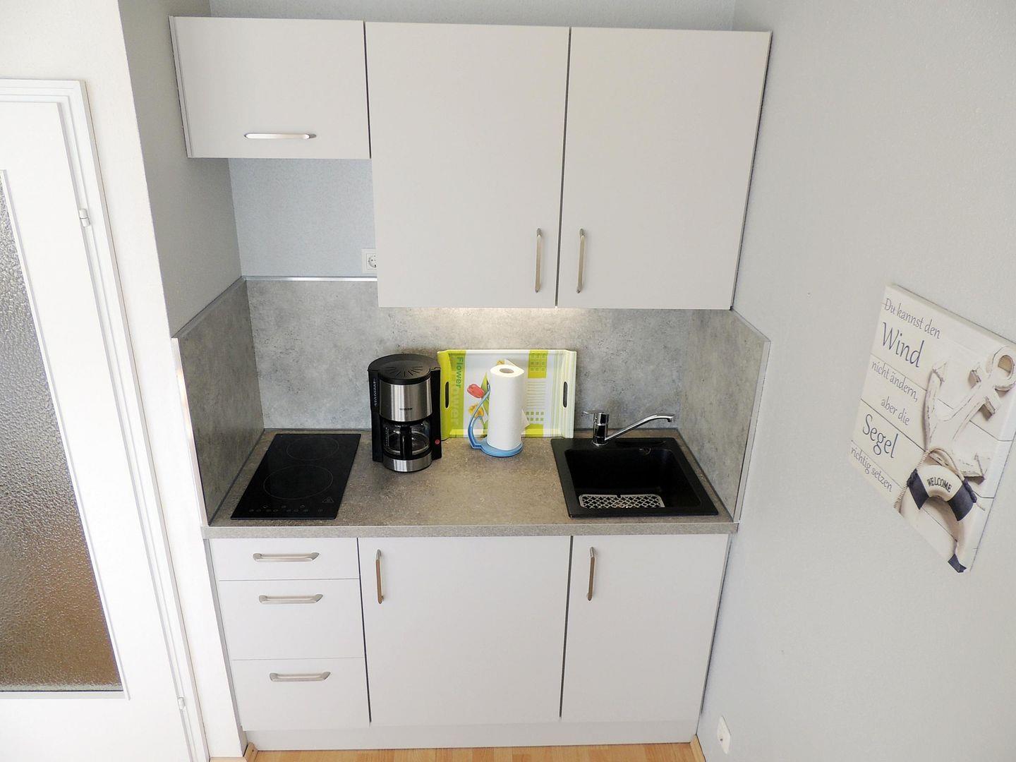 Die Küchenzeile verfügt über einen 2-Feld-Ceranherd, Kühlschrank mit Gefrierfach, sämtliche Kochutensilien sowie umfassendes Geschirr.