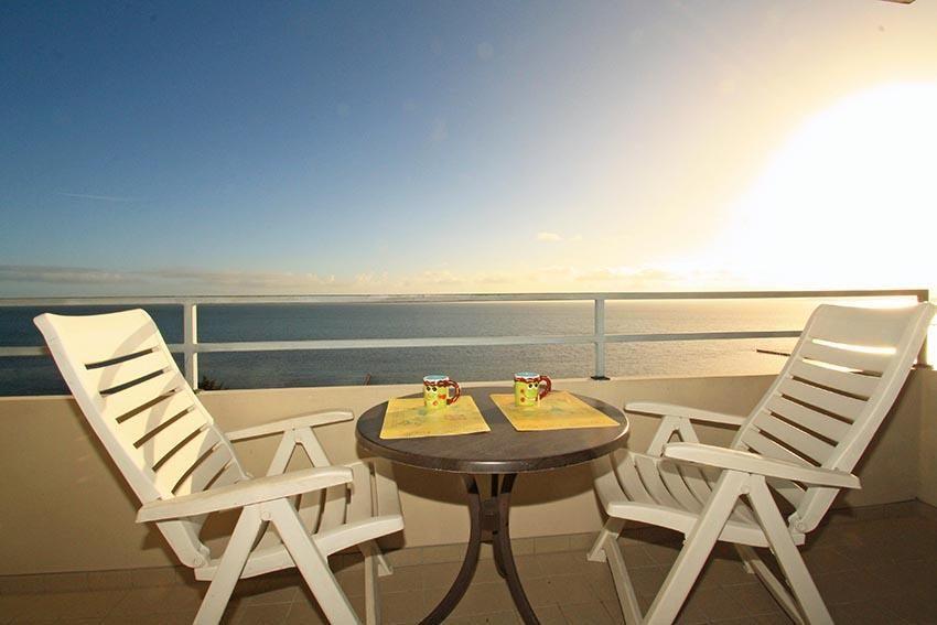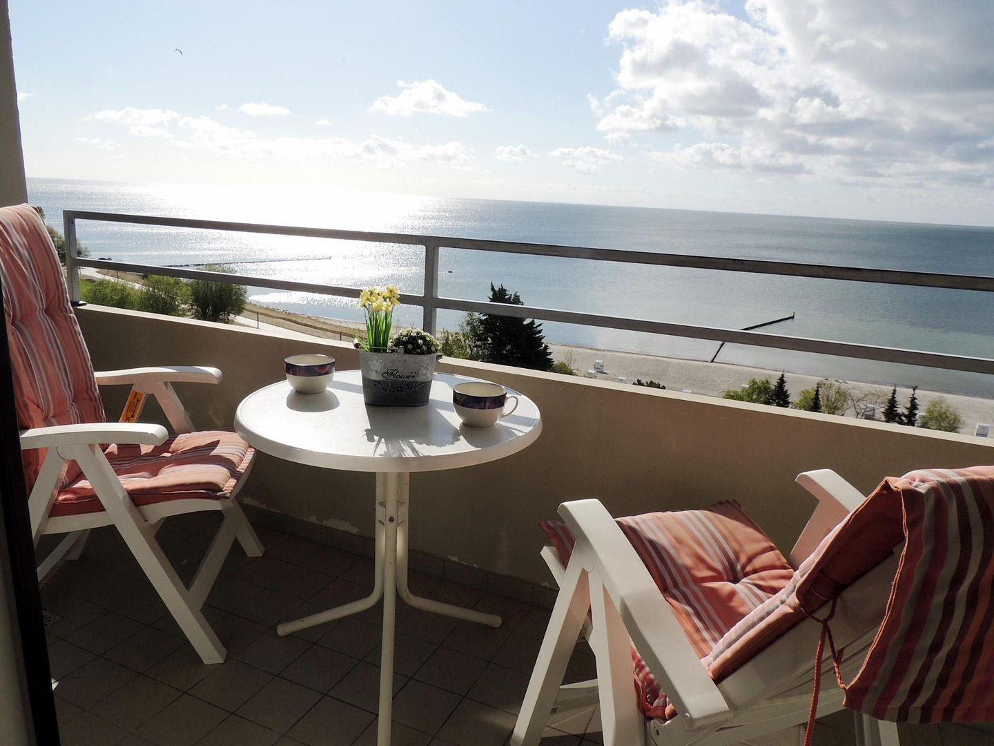 Vom Balkon genießen Sie aus dem 8. Stock den direkten, atemberaubenden Blick auf das glitzernde Meer zu Ihren Füßen. Gemütliche Hochlehner mit Polsterauflagen und ein Bistrotisch laden zum Entspannen, Krafttanken und Sonnen ein.