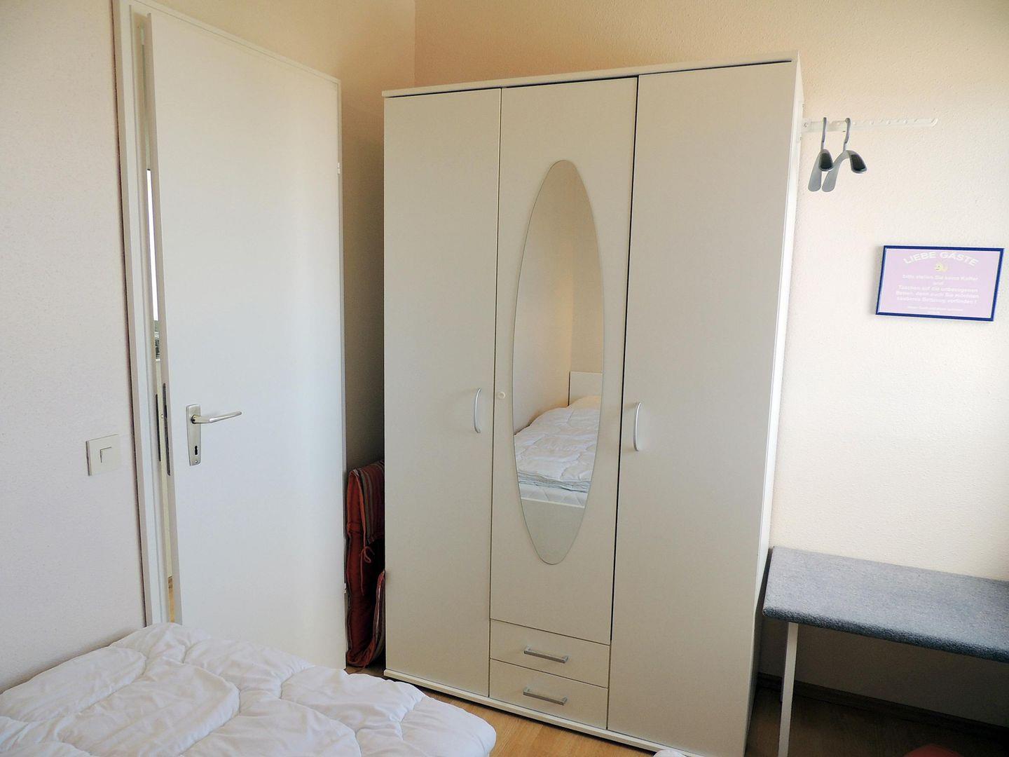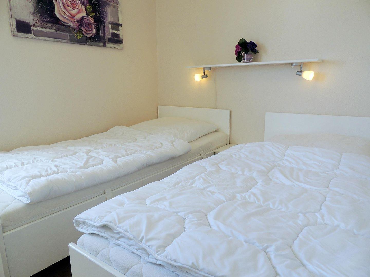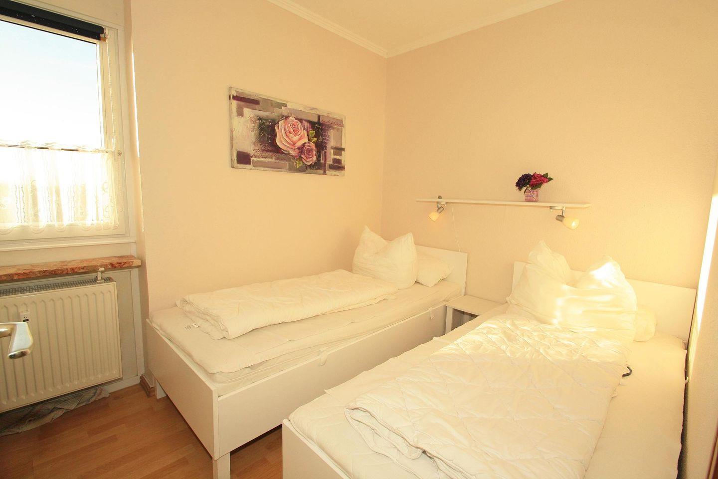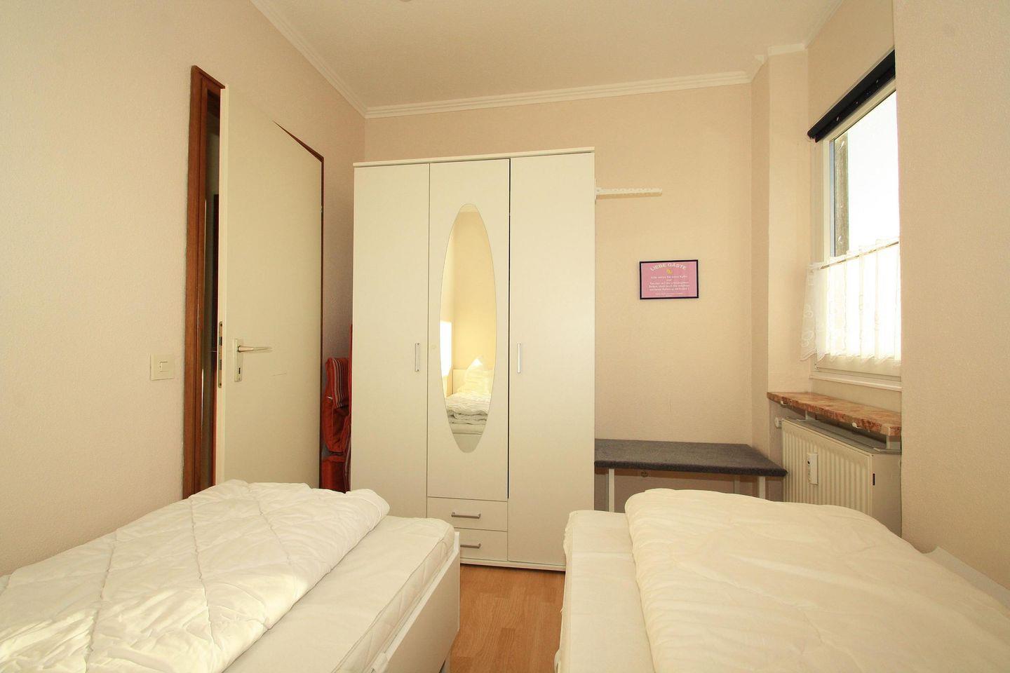 In dem separaten Schlafzimmer mit Ausblick auf den gesamten Südstrand mit Promenade befinden sich zwei Einzelbetten (90*200 cm & 90*190 cm) und ein Kleiderschrank mit Spiegel.