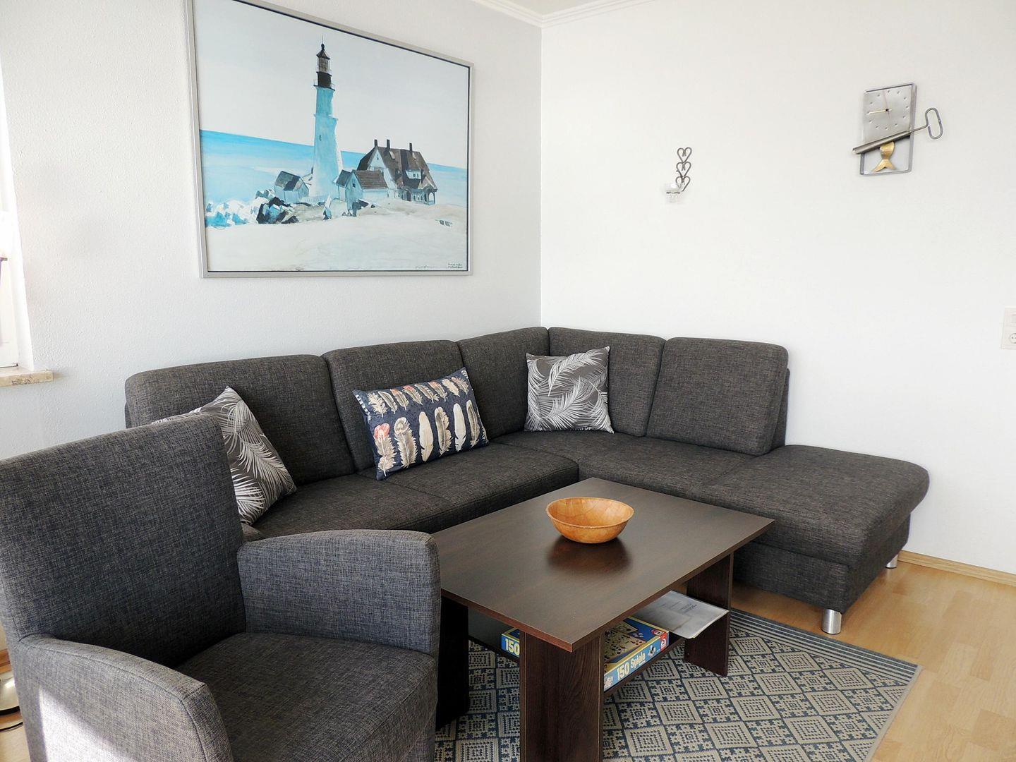 Die große und bequeme Couch kann bei Bedarf als Schlafgelegenheit genutzt werden. Ein Sessel steht zusätzlich bereit. Flachbildfernseher (32 Zoll) und W-Lan-Zugang runden Ihr Unterhaltungsangebot ab.