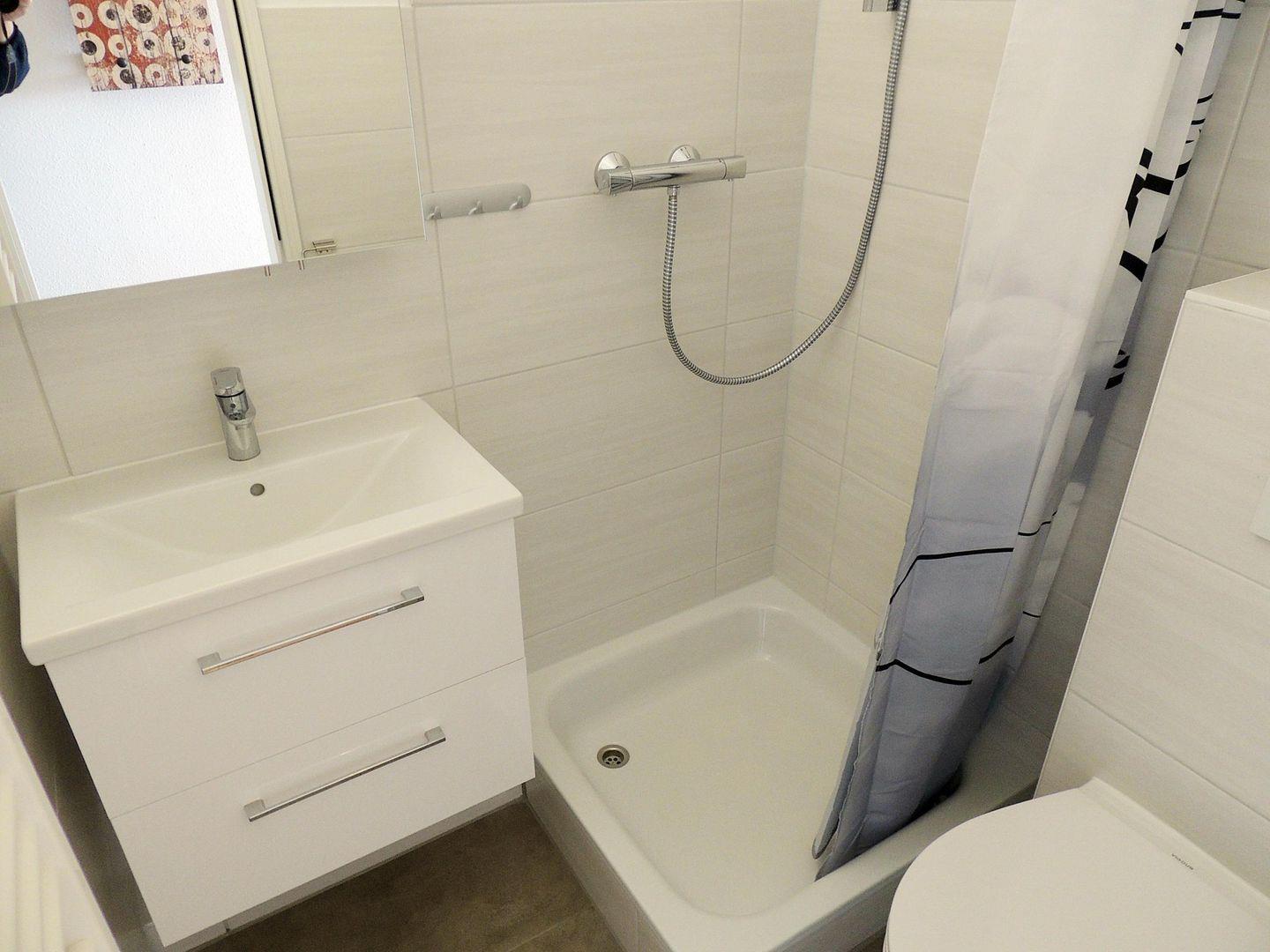 Das modern sanierte, innenliegende Duschbad verfügt über einen beleuchteten Spiegelschrank, einen Handtuchheizkörper, Waschbeckenunterschrank mit Schubladen und eine Dusche mit Wanne und Duschvorhang.