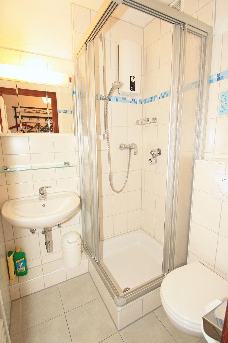 Im innenliegenden Duschbad mit fester Duschwand und beleuchtetem Spiegelschrank finden Sie einen praktischen Handtuchheizkörper.