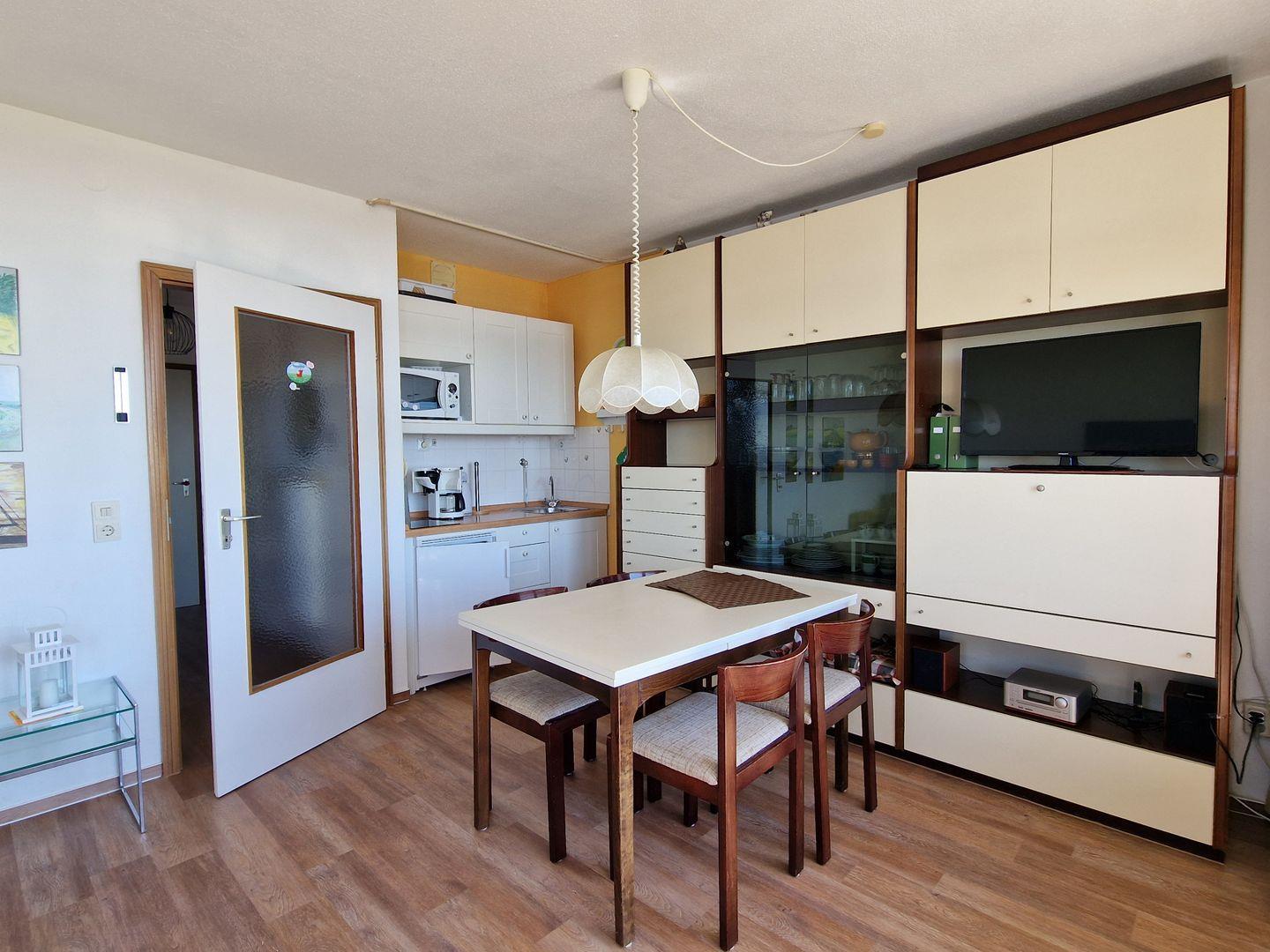 Die kleine Küchenzeile ist funktionell ausgestattet: Ein Zwei-Feld-Ceranherd sowie Microwelle, Kühlschrank und Spüle stehen Ihnen hier zur Verfügung. Der Esstisch bietet ausreichend Platz. Oder essen Sie lieber mit Blick aufs Meer auf dem möblierten Balkon? Hier steht ein Tisch mit zwei Stühlen für Sie bereit.