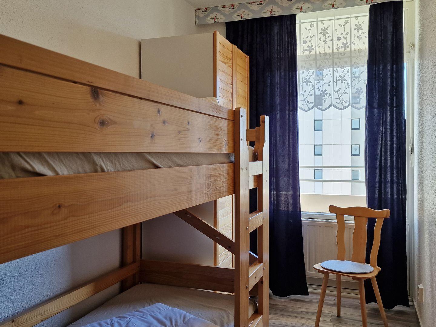 Die Ferienwohnung in attraktiver Südstrandlage bietet ein großes Doppelbett (180*200 cm) im, durch einen Vorhang abgetrennten, Wohnbereich und ein Etagenbett (2*80*200 cm) im separaten Schlafzimmer mit Fenster und neuem Vinylboden. Im Wohnbereich steht ein 26 Zoll-TV-Gerät zu Ihrer Unterhaltung bereit.