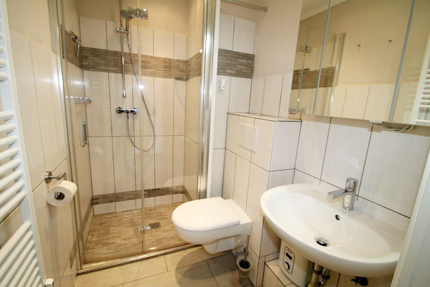 Das moderne, innenliegende Duschbad mit beleuchtetem Spiegelschrank, Steckdosen, bodengleicher Dusche und zweiteiliger Glas-Duschwand bietet zusätzlich einen praktischen Handtuchheizkörper.