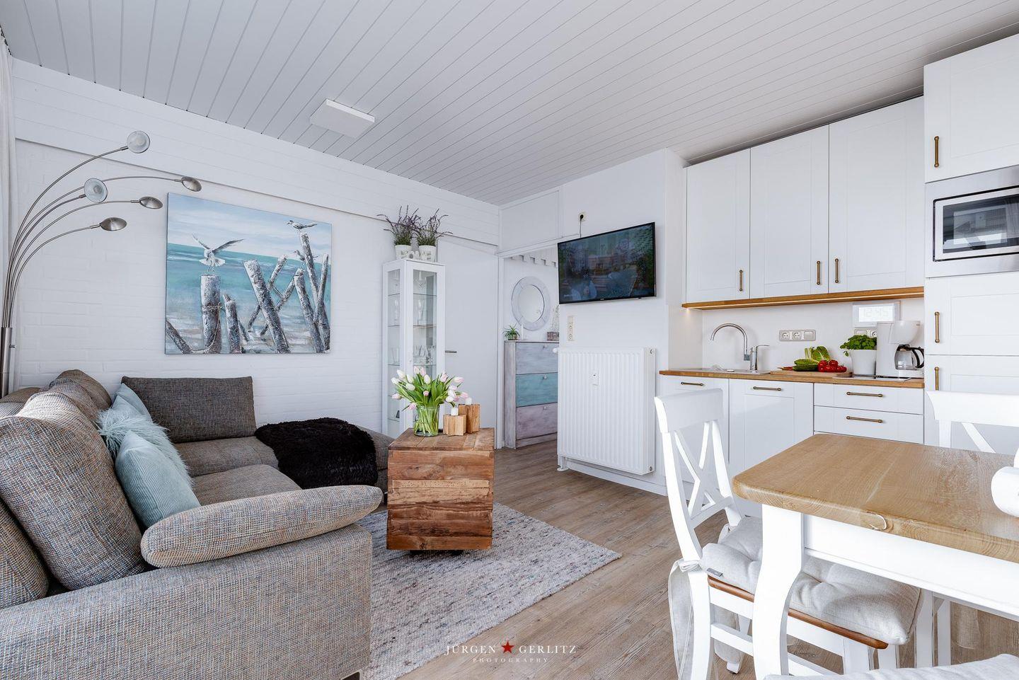 Der Wohnbereich steht ganz im Zeichen des schönsten Ausblicks den sich Meerliebhaber vorstellen können: Strandhaferbepflanzte Dünen, Holzstege mit Sonnenliegen die durch die Dünen führen, die neue Promenade, der breite weiße Sandstrand, die Seebrücke und dann - nur noch die Ostsee: Mal glatt wie ein Spiegel, dann glitzernd die Sonne reflektierend, ein anderes Mal wütend tobend voller weißer Schaumkronen.