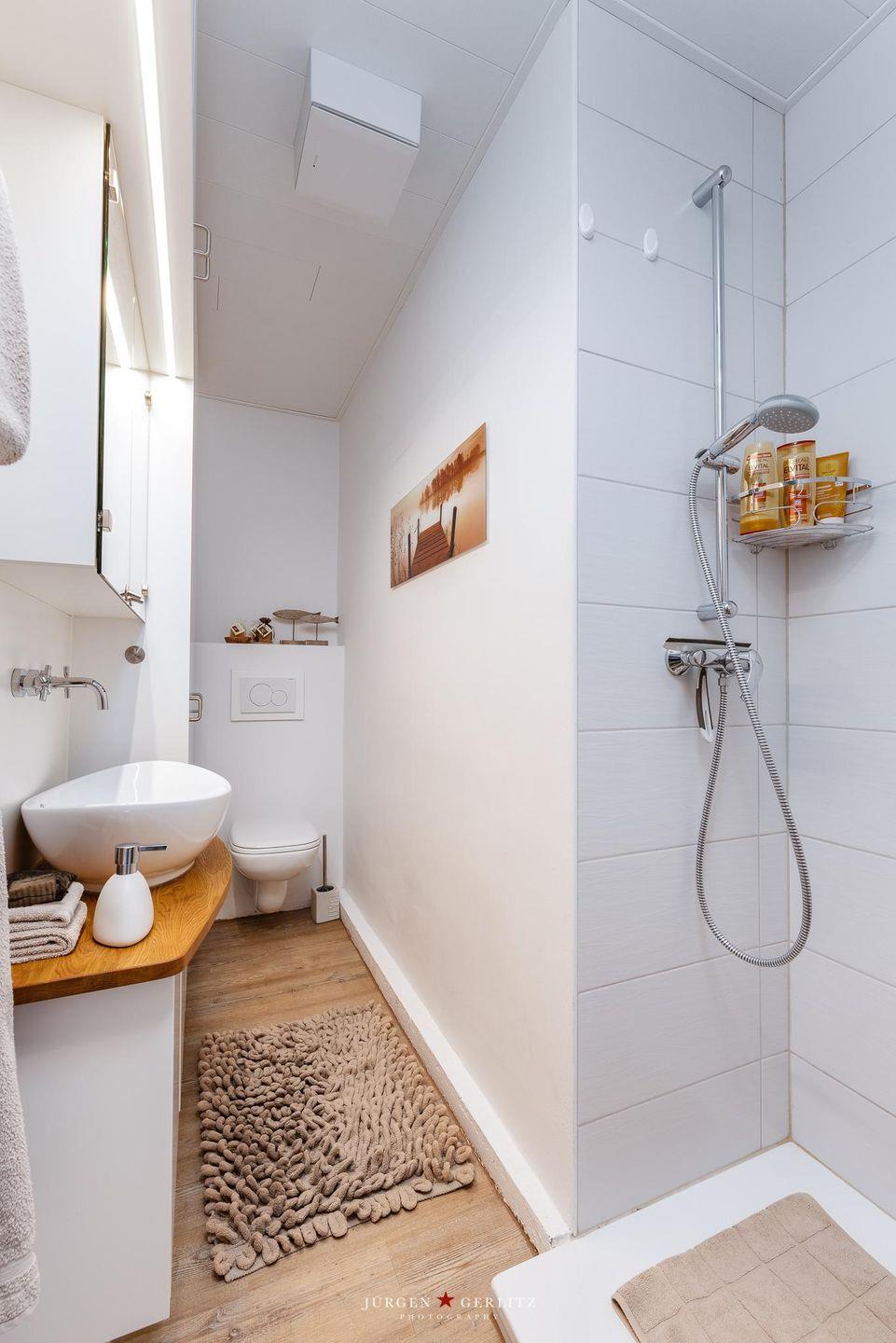 Nebenan finden Sie das sanierte und modern ausgestattete Duschbad mit Handtuchheizkörper, Einbauschränken, Dusche mit flachem Einstieg und Duschvorhang und beleuchtetem Spiegelschrank.
