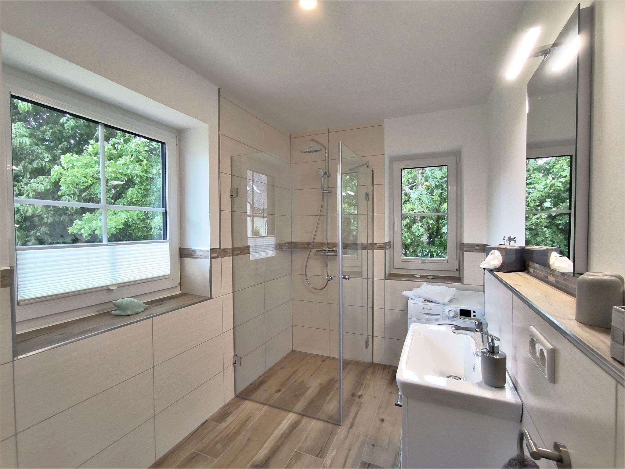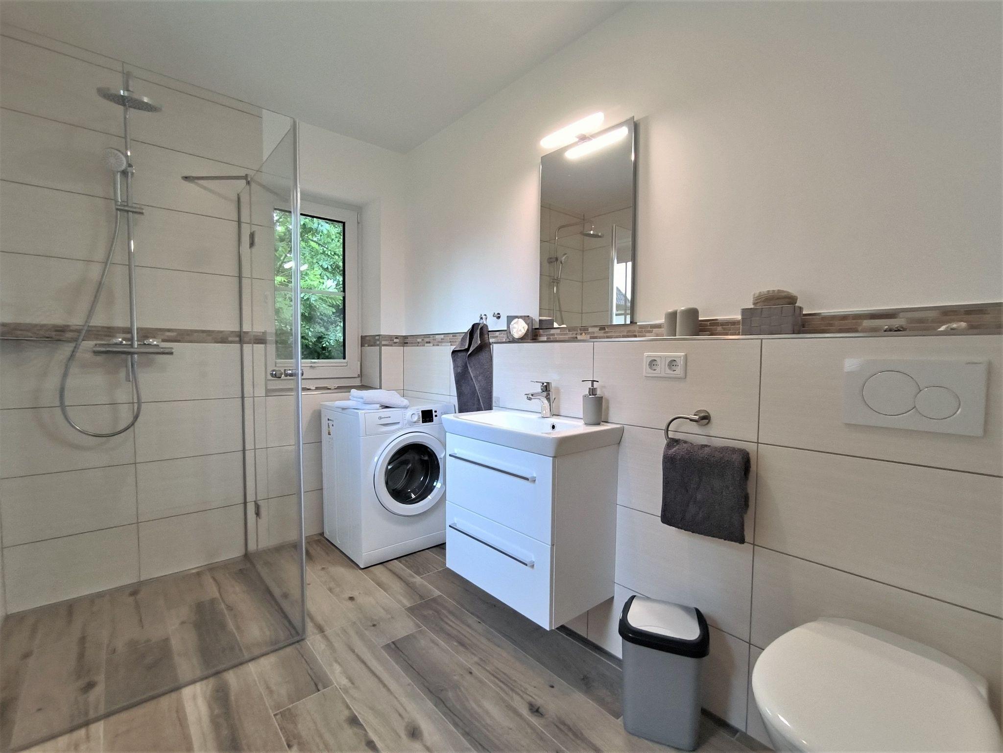 Der große Wohn- und Essbereich ist mit einem runden Esstisch, einem Sofa (Schlafsofa 1,80 x 2,00m), TV und einer bestesn ausgestatteten Küche eingerichtet. Von hier aus geht es auf die Terrasse: diese ist mit Gartentisch und -stühlen sowie einem Strandkorb ausgestattet. Im Schlafzimmer stehen ein Doppelbett (1,80m x 2,00m) und ein Kleiderschrank, das Zimmer ist mit Verdunklungsvorhängen und Fliegenfenstern versehen. Das moderne Badezimmer mit Tageslicht hat eine ebenerdige Dusche, Waschbecken und Toilette sowie eine Waschmaschine. Es stehen ein abschließbarer Raum für Fahrräder o.ä. und ein Carport direkt am Haus zur Verfügung. In demselben Gebäude findet sich noch eine zweite, größere Wohnung für bis zu sechs Personen (Buchenblick).