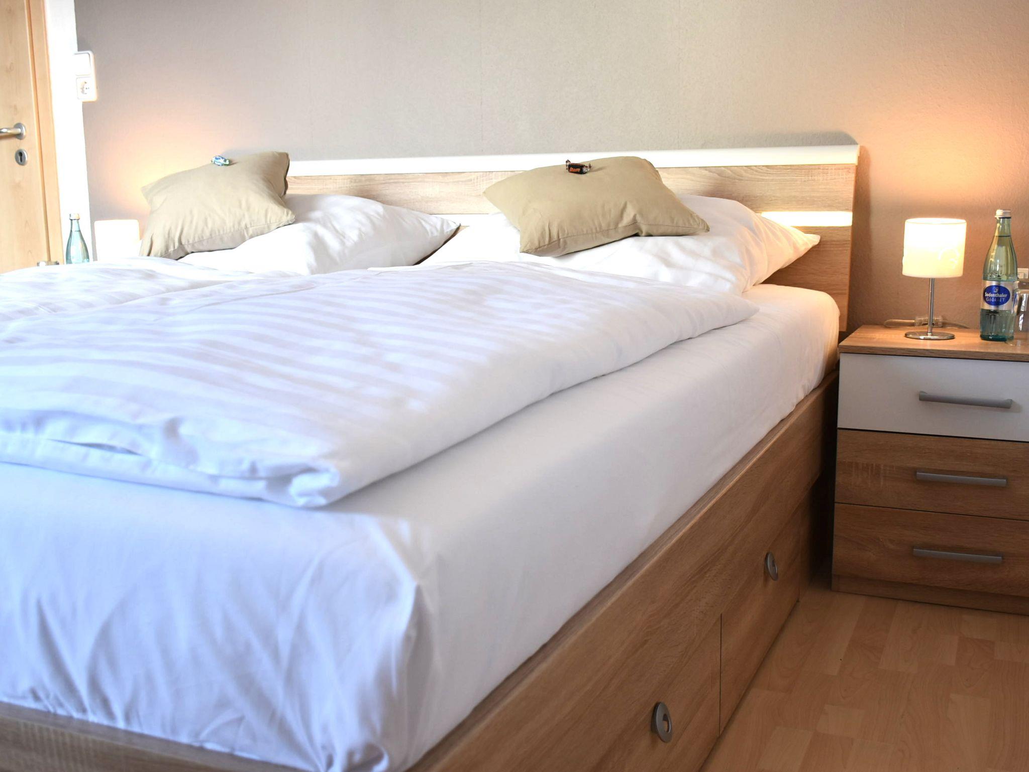 Doppelbett, großer Kleiderschrank, 2 Nachttische mit Lampen, 1 Wecker, USB-Steckdose