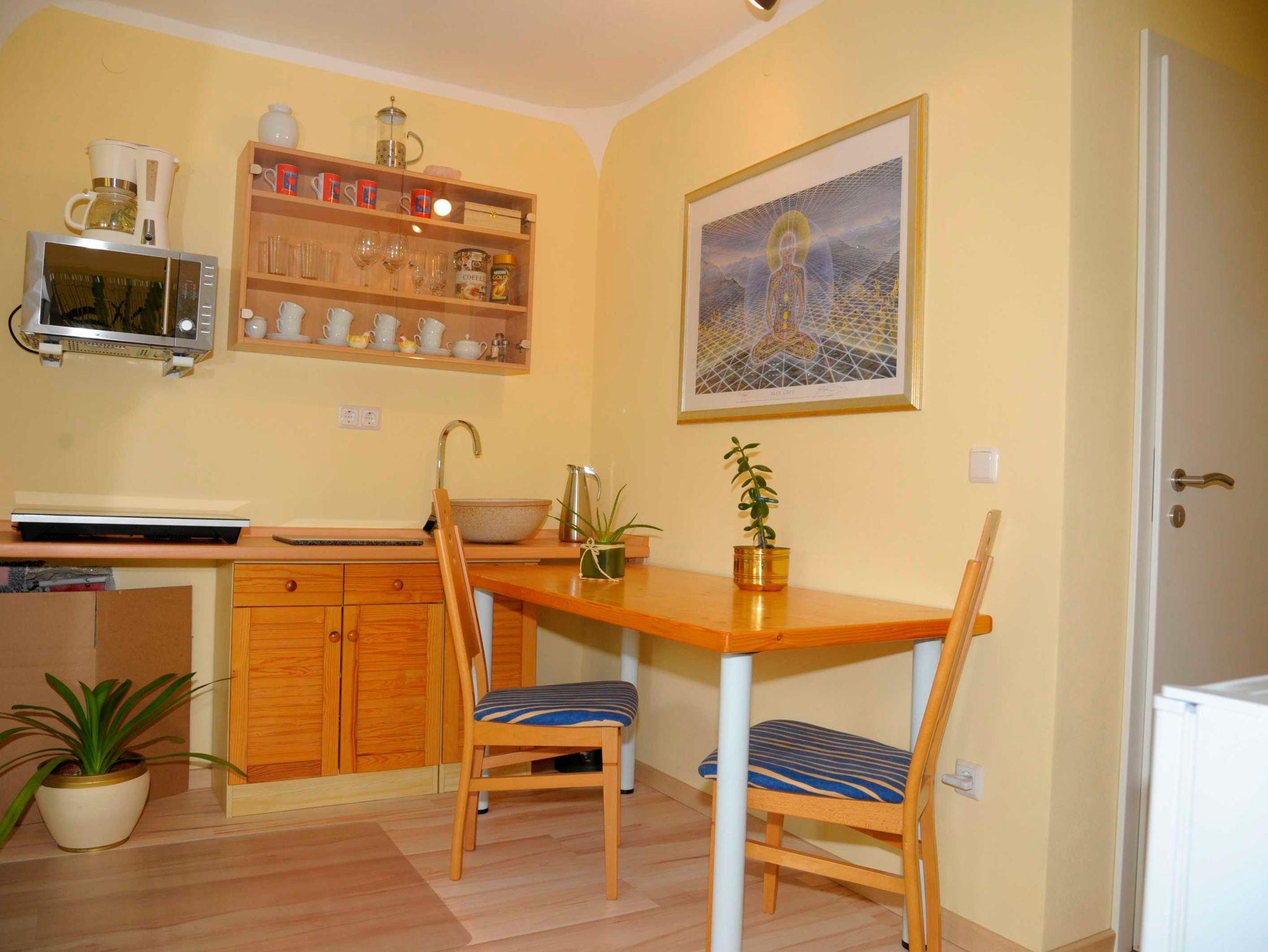Gemütlich, mit hellen warmen Farben eingerichtetes Apartment in Premiumplusklasse sind unser Angebot für Sie zum Wohnen auf Zeit und für Wochenendheimfahrer. Kleine Küchenzeile mit Geschirr, 2 Inductionsherdplatten, Kühlschrank, Mikrowelle, Kaffeemaschine, Wasserkocher, Toaster