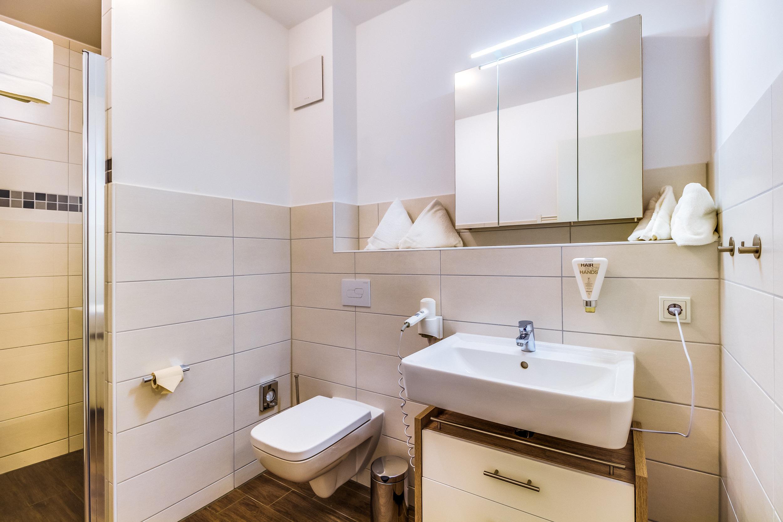 - Badezimmer mit WC und ebenerdiger Dusche sowie Fön