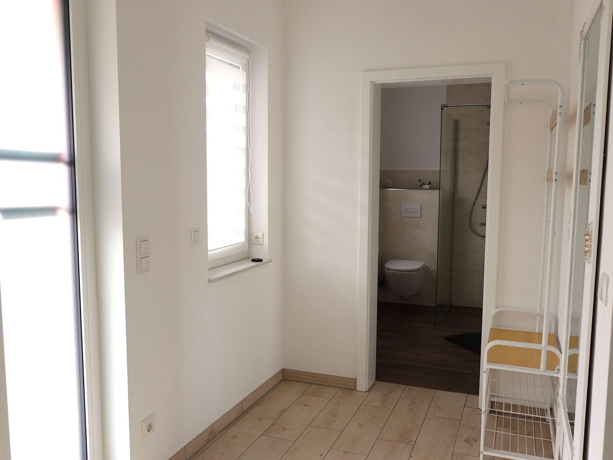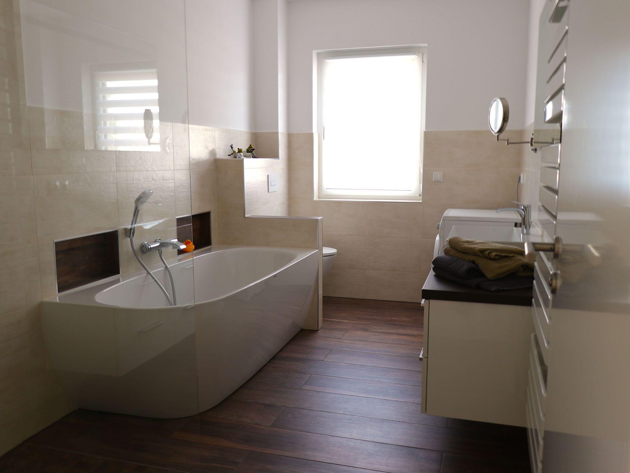 • Bad mit Wanne, bodengleicher Dusche, WC, beheizbarer Spiegel, Kosmetikspiegel, beheizbarer Handtuchhalter, Ambientebeleuchtung, Waschmaschine