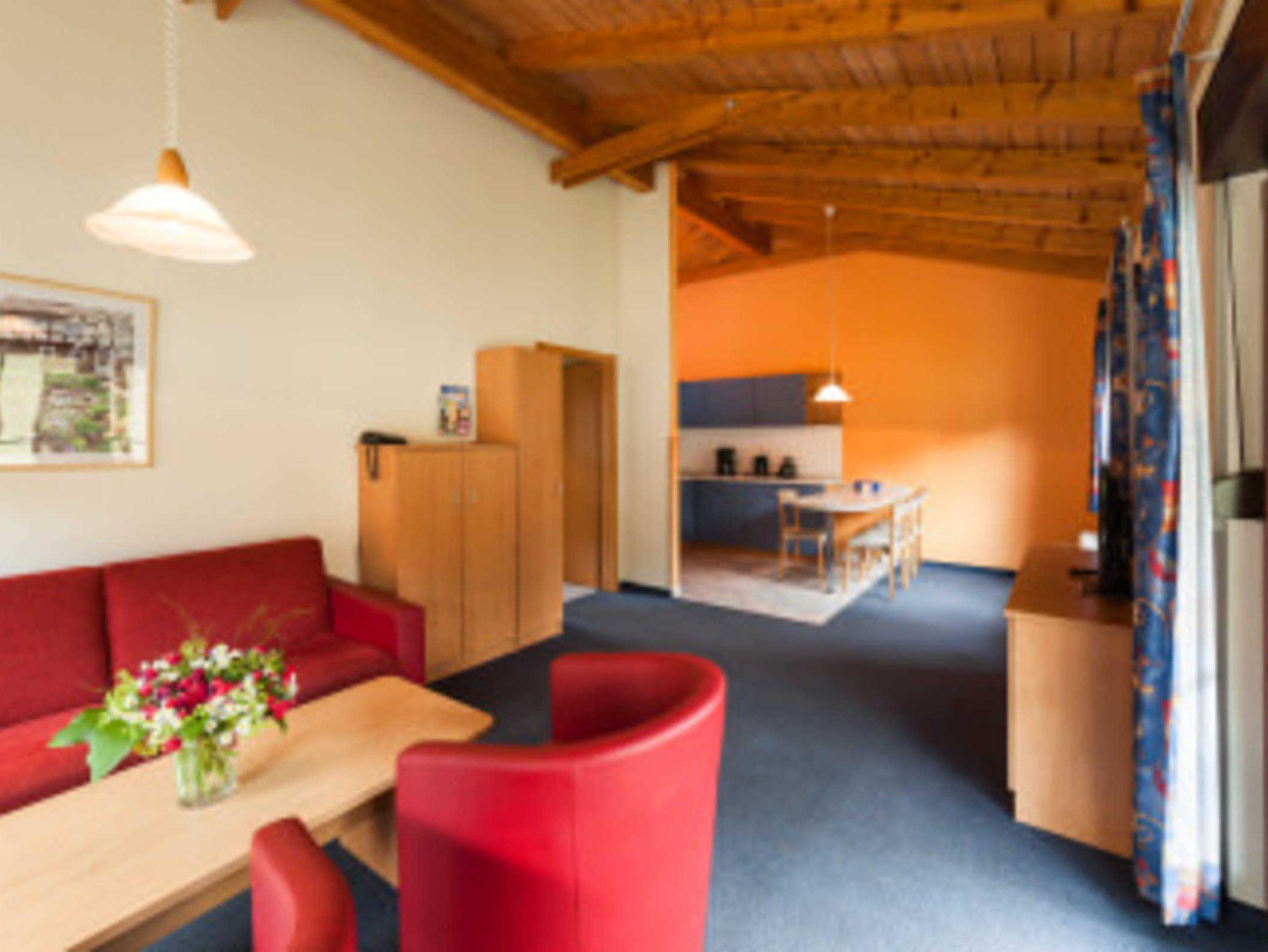 45 m² Wohnfläche 1 Schlafraum mit Doppelbett 1 Wohnzimmer mit Doppelausziehcouch (2 Aufbettungen), SAT-TV, Essecke und offene, komplett eingerichtete Küchenzeile 1 Bad mit Dusche und WC möblierte Terrasse in den Sommermonate