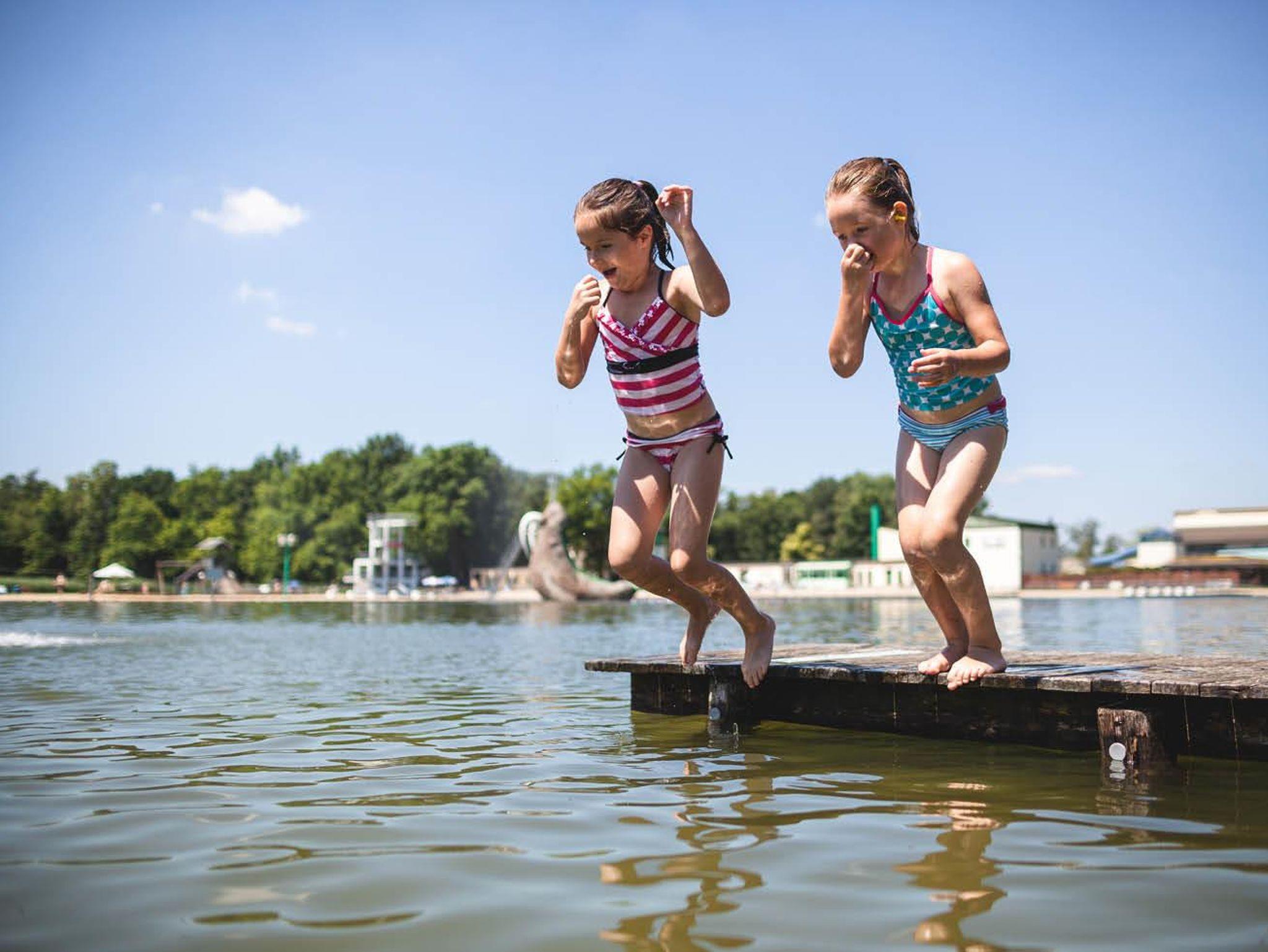 das Waldstrandbad mit der Walross-Rutsche und einem 10-Meter-Sprungturm, auf dem Ihr