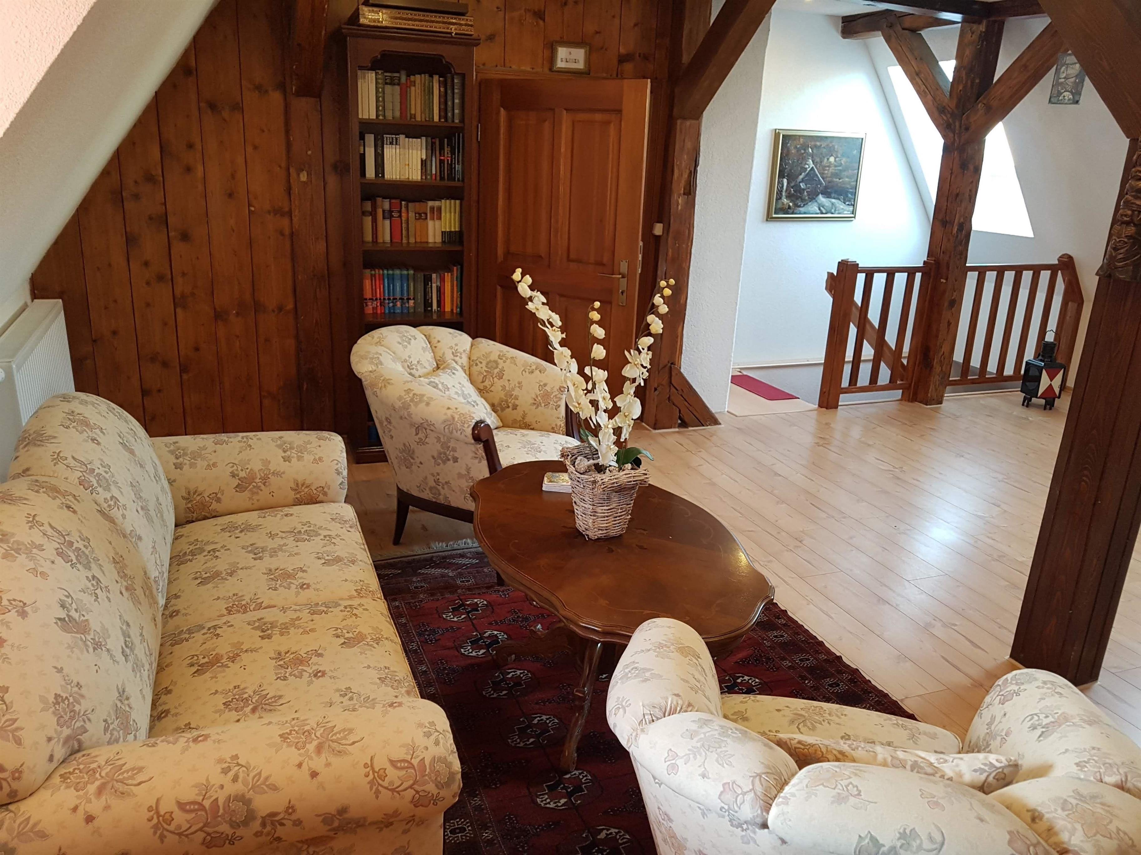 Im DG finden Sie neben den 3 Schlafräumen mit je einem Doppelbett, ein Bad mit Wanne und Sitzdusche, einen großen Aufenthaltsraum mit gemütlichem Sofa und weichen Sesseln. Der Raum ist ausgestattet mit einem großen Flachbildschirm TV, DAB-Radio mit USB-Anschluss, CD und Bluetooth- Lautsprechern, Spielen und einer Bibliothek.