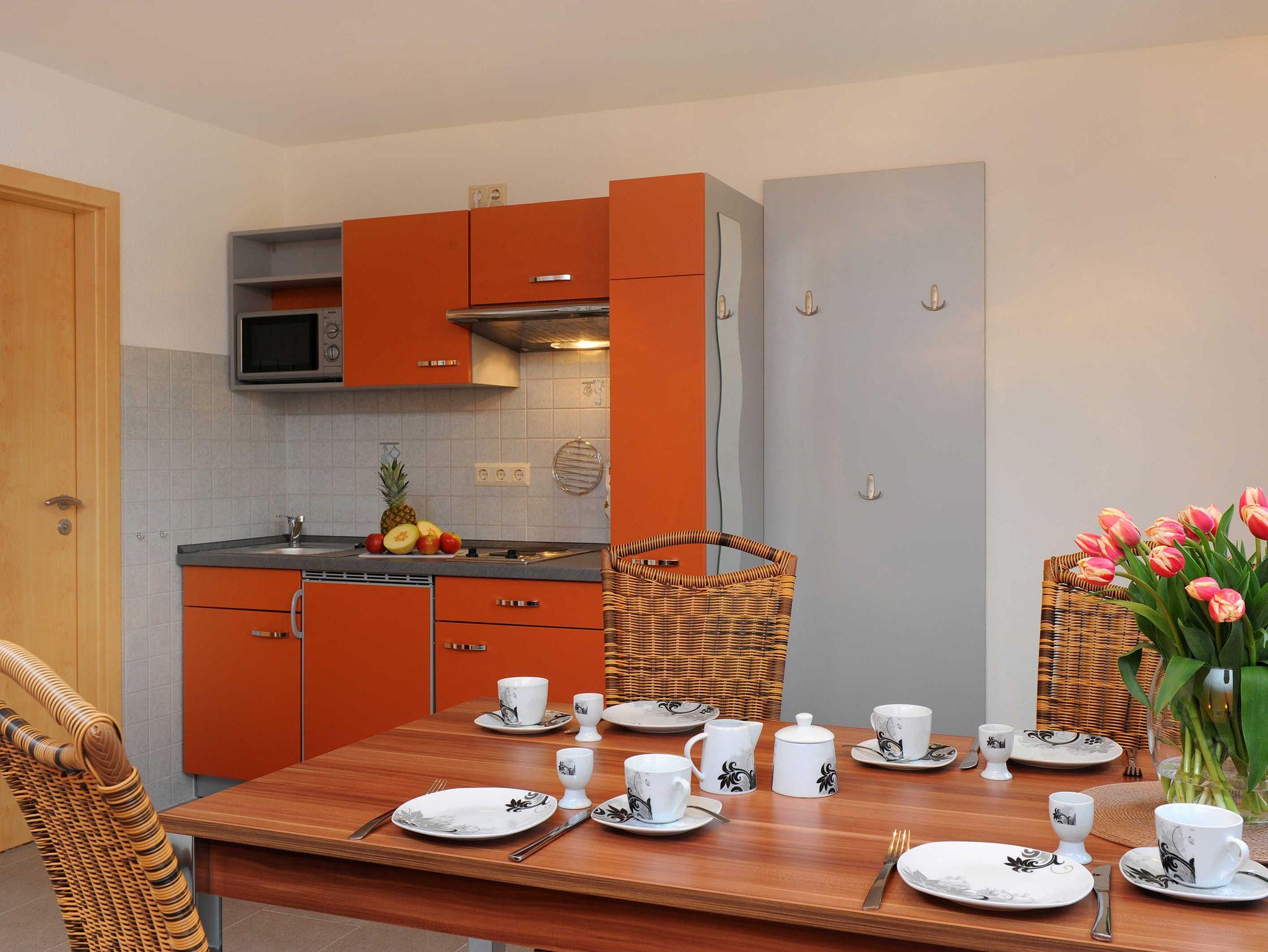 (Spüle, 2 Platten-Elektroherd, Mikrowelle, Kühlschrank mit Gefrierfach, Umlufthaube, Kaffeefiltermaschine, Toaster, Wasserkocher und umfangreiche Geschirr-, Gläser-, Besteck- und sonstige Ausstattung)