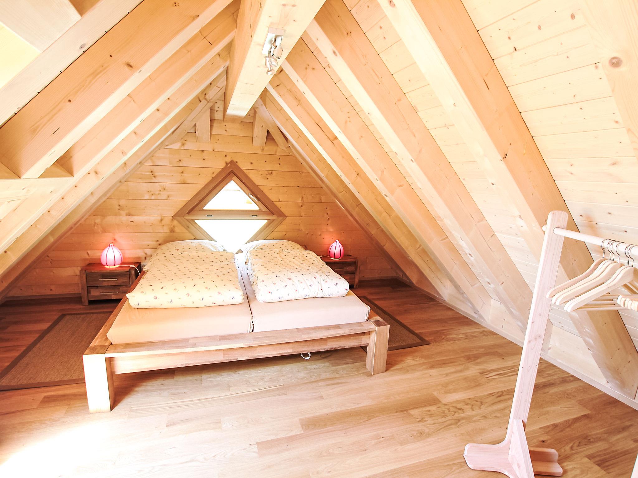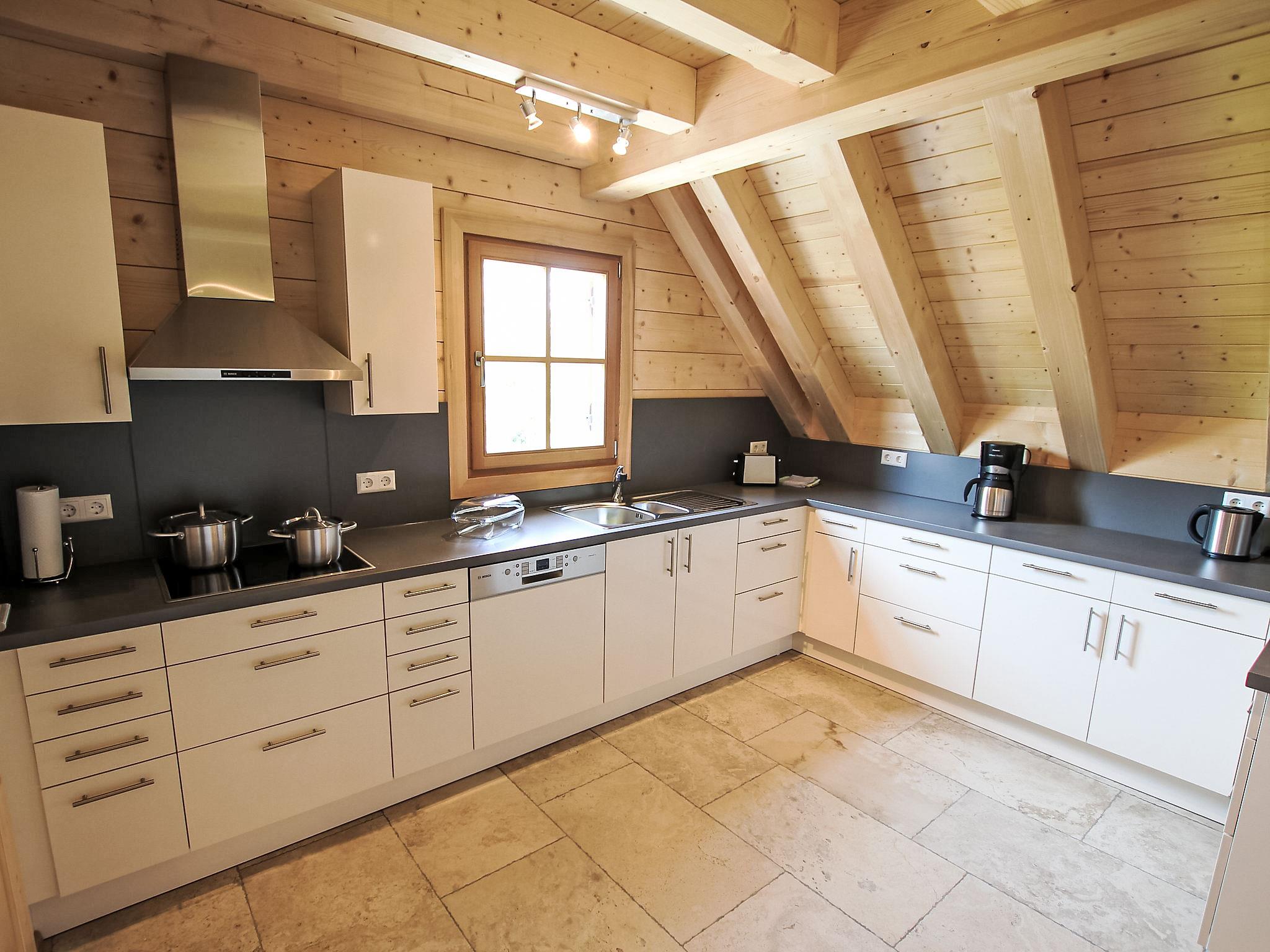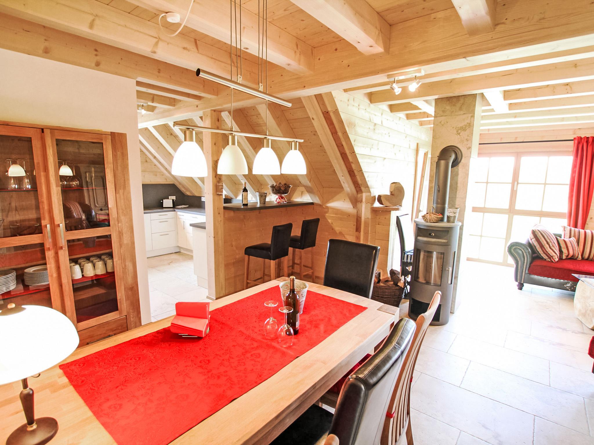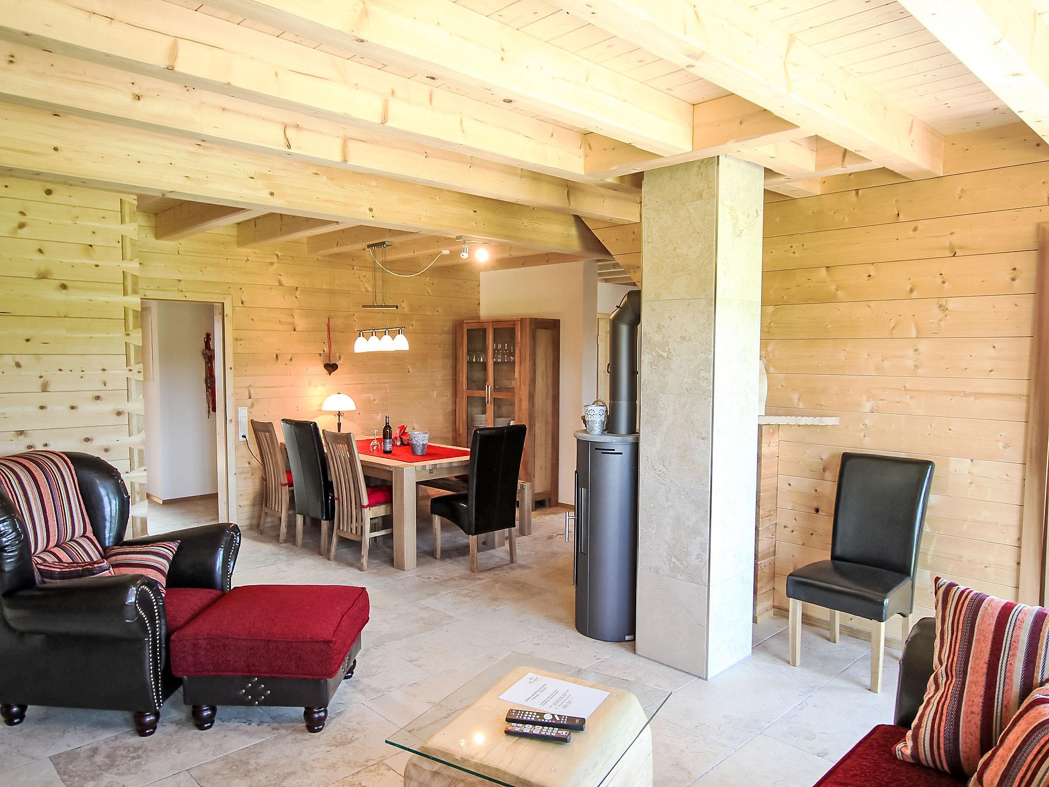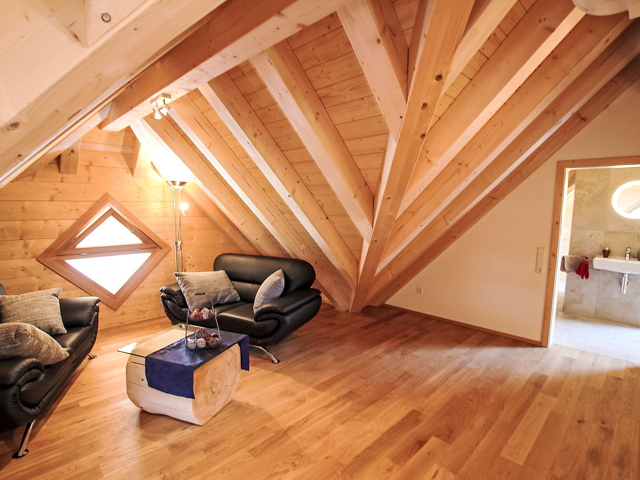 "Lärche", 5-room maisonette 150 m2 on 2 levels on 2nd floor. Stylish and wooden furniture furnishings: living/dining room with Scandinavian wood stove and satellite TV (flat screen). Exit to the balcony. 1 double bedroom. 1 room with 1 bed. Kitchen (oven, dishwasher, 4 ceramic glass hob hotplates, electric coffee machine). Sep. WC, bath/shower/WC. Top floor: 2 double bedrooms with sloping ceilings. Shower/WC. Heating. Balcony furniture. Very beautiful view of the countryside. Facilities: logs (free). Internet (WiFi, free). Please note: non-smokers only. Smoke alarm.